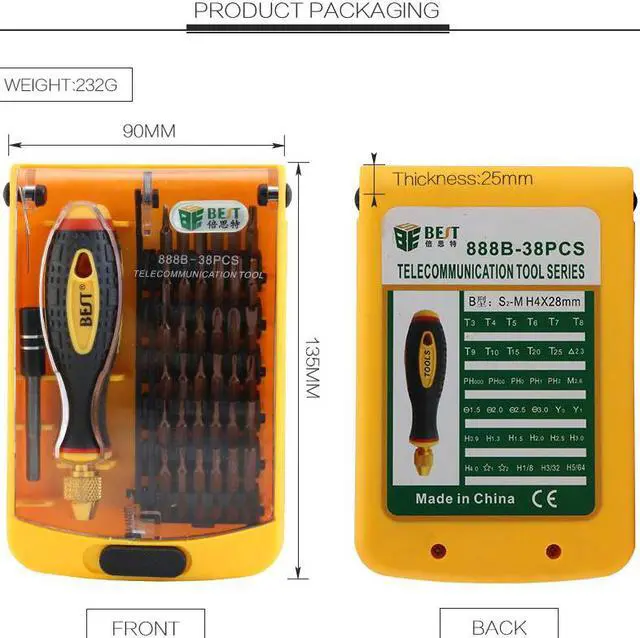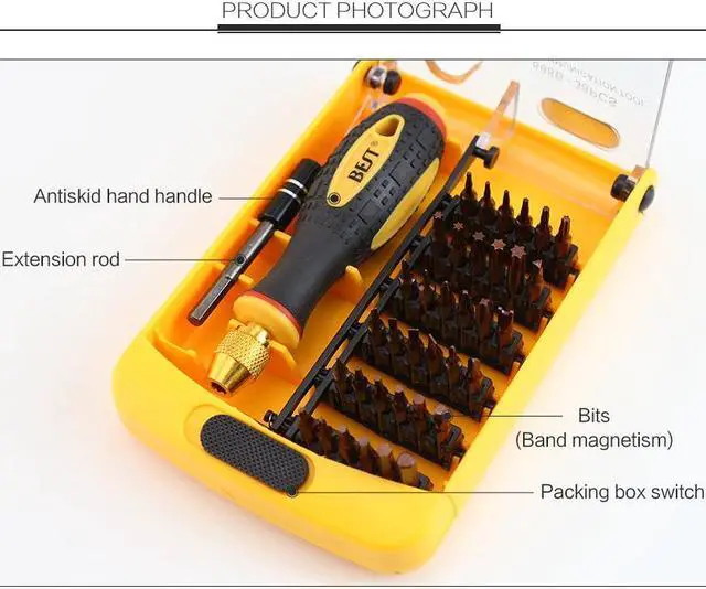 BST-888B Strong Magnetic Precision Screwdriver Set for Computer Laptop Repairing The size of the screwdriver can be adjusted as your demand. The long screwdriver bit can reach narrow place easily. The screwdriver head is processed in high temperature, the bit is black coating, it still works well after using a long time. Strong magnetic screwdriver bit, compete specification, high precision screwdriver set 38pcs interchangeable screwdriver set can be used almost all cell phone, laptop, computer, XBOX, 3ds, macbook air/pro, and other electronic repairing