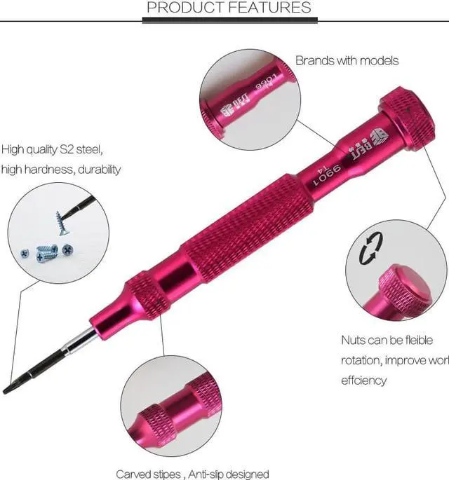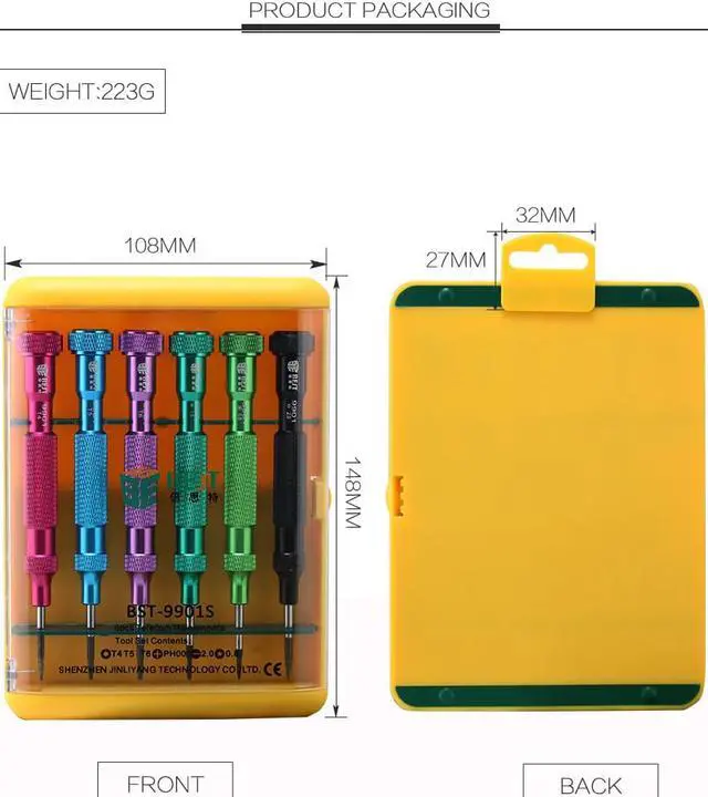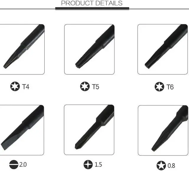 Material: S2 steel Size: 110*147*22mm Weight: 222g Precision Screwdriver for iPhone,iPad,Notebook,Computer and other device. Screwdriver handle is made of Aluminium alloy,the middle of the handle has increases the friction,make sure will Non slip when you're working. Magnetic Screw Bits are made of CR-V material,Non-rust and Durable,increase the effective. Screw bits type including Slotted,Torx,Phillps,Pentalobe. Equipped with a carry box,lightweight and portable,easy to store.