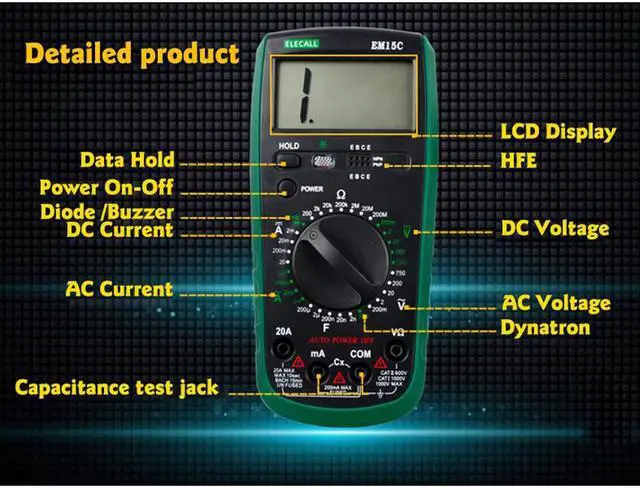 ELECALL EM15C 2000 Counts Multimeter Plastic Shell LCD Display AC/ DC Testing Auto Power Off Digital Multimeter Product Name Digital Multimeter AC Voltage (V) 200mV, 2V, 20V, 200V, 750V DC Voltage (V) 200mV, 2V, 20V, 200V,1000V AC Current (A) 2mA, 20mA, 200mA,20A DC Current (A) 2mA, 20mA, 200mA,20A Resistance () 200 , 2k , 20k , 200k , 2M , 20M,200M Capacitance (F) 2nF/20nF/200nF/2uF/200uF Other Measure Function Diode & Transistor, Buzzer Main Color Black & Green Mateiral Plastic & Metal Data Hold Yes Multimeter Size 141*44*201mm Net Weight 419g Low battery indication Yes