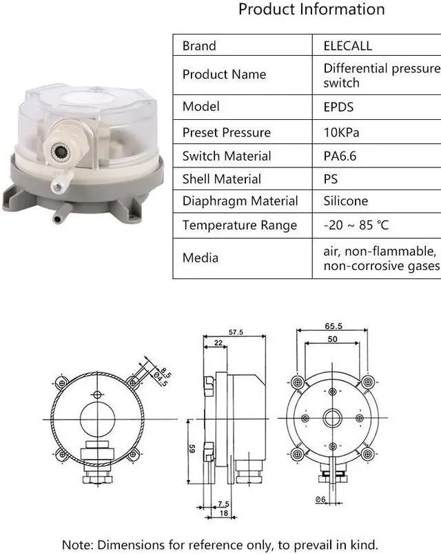 Features:Brand: ELECALLProduct Name: Differential Pressure SwitchModel: EPDSMax. Working Pressure: 10KPaType: Gas SensorOutput: Analog SensorMounted Screew Diameter:4mmPackage Size:110*108*110mmColour:As Picture ShownProduct Material:--Switch Material: PA6.6--Shell Material: Plastic--Diaphragm Material: SiliconeTemperature Range: Medium and ambient temperatures from -20 ~ 85 CMedia: air, non-flammable and non-corrosive gases Introduction:This pressure switch is primarily used in ventilation and air conditioning systems for monitoring the air flow in air ducts, as well as in filters, flaps and fans. They are suitable for air and also other non-inflammable and non-aggressive gases. Application:This switch is capable to sense tiny pressure change and widely used to control the flue of aerator, to monitor and fan and air conditioner. It is also suitable for over heating protection and frost protection in industrial cooling system. Due to its outstanding design, the setpoint can be adjust visually.