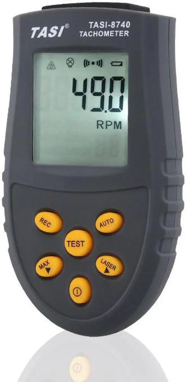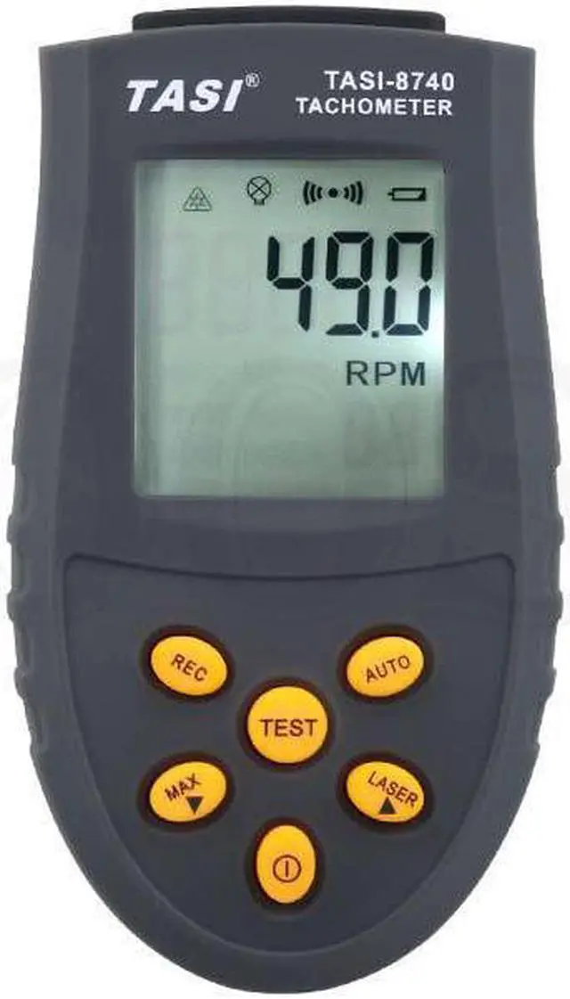 TASI-8740 Non-contact Tachometer 2.5 ~ 99999RPM range Optical Tachometer motor motor laser speed tester Product Specifications Measuring range 2.5 RPM to 99999 RPM Accuracy (0.05% + 1digits) Resolution 2.5 to 999.9rpm: 0.1rpm; 1000 to 99999rpm: 1rpm Sampling rate 2.0times / second (more than 120 revolutions) Effective measured range 50 to 500mm Ground mass Quartz crystal Manual / Automatic measurement Laser adjustable brightness MAX / MIN / AVG reading Data storage capacity 50 Data hold function Low battery indication Display 5 digit LCD display with maximum reading of 99999 Power 2 * 1.5V AAA alkaline batteries (NOT INCLUDED) LCD size 35 * 32mm Dimensions 108 * 60 * 32mm Weight Approx.70g (no battery) Package Content Photoelectric Tachometer, Instruction, warranty card Package manner Paper box