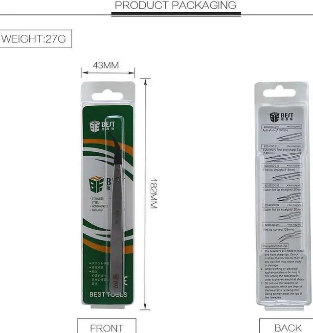 Material: Stainless steel handle+PPS ESD plastic head Magnetism: Non Length:125.6mm Weight:25g Strength: >HRC40(handle),high strength plastic (head) Head adopts ESD PPS plastic Side polished handle, feel comfortable, easy to use Suitable for PCB semiconductor, microelectronics, medical,beaty industry It is also bearable for acid, alkali and high temperature environment. Stainless steel handle Acid-proof, the anticorrosion, is not rusty Surface using very good special plating processing, smooth, use very comfortable.