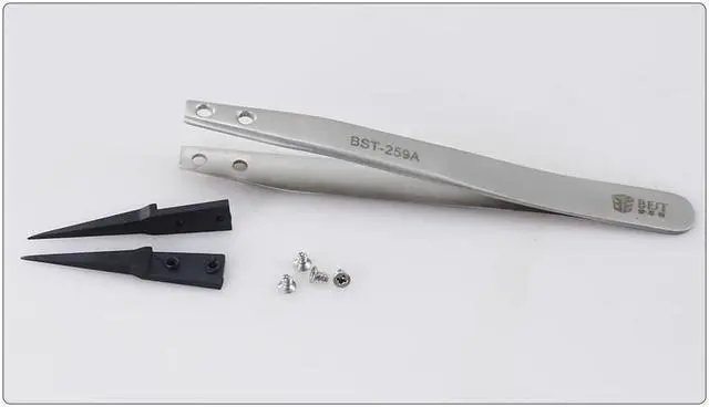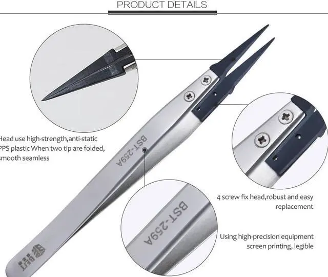 Material: Stainless steel handle+PPS ESD plastic head Magnetism: Non Length:128mm Weight:25g Strength: >HRC40(handle),high strength plastic (head) Head adopts ESD PPS plastic Side polished handle, feel comfortable, easy to use Suitable for PCB semiconductor, microelectronics, medical,beaty industry It is also bearable for acid, alkali and high temperature environment. Stainless steel handle Acid-proof, the anticorrosion, is not rusty Surface using very good special plating processing, smooth, use very comfortable.