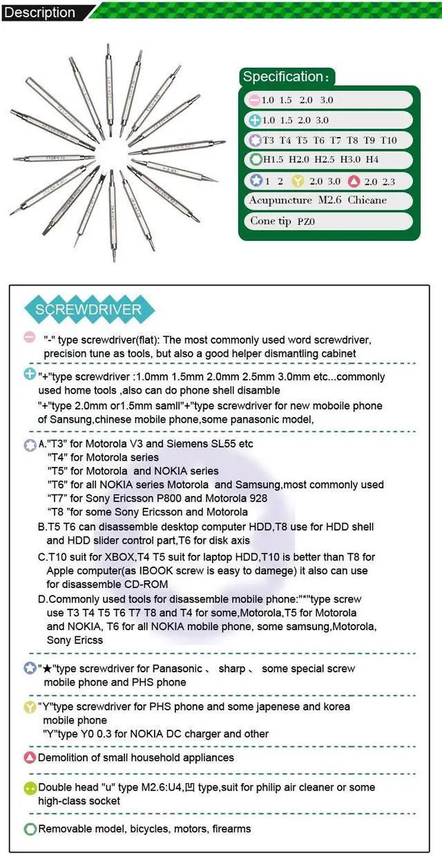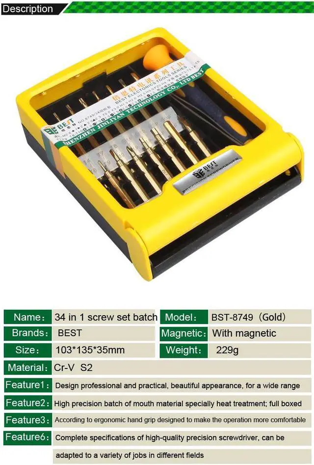 Material:CR-V, S2 Package Size:103*135*35mm Weight:229g Magnetic:With magnetic Color: Gold/Silver (random) Design professional and practical, beautiful appearance, for a wide range. High precision batch of mouth material specially heat treatment; full boxed. According ergonomic hand grip designed to make the operation more comfortable. Complete specifications of high-quality precision screwdriver, can be adapted to a variety of jobs in different fields.