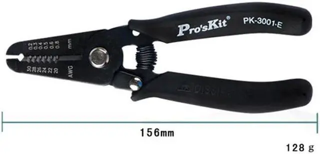 1PK-3001E Anti-static Electronic Wire Stripper Multifunction Wire Stripper Clamping Pliers Length: 156mm Precise size, with cutting and clamping function 6 Hole stripping, and with cutting and clamping function Material Hardness Range(AWG) Range(MM) Packing SK7 HRC 503 30,28,26,24,22,20 0.2,0.3,0.4,0.5,0.6,0.8 Blister Card