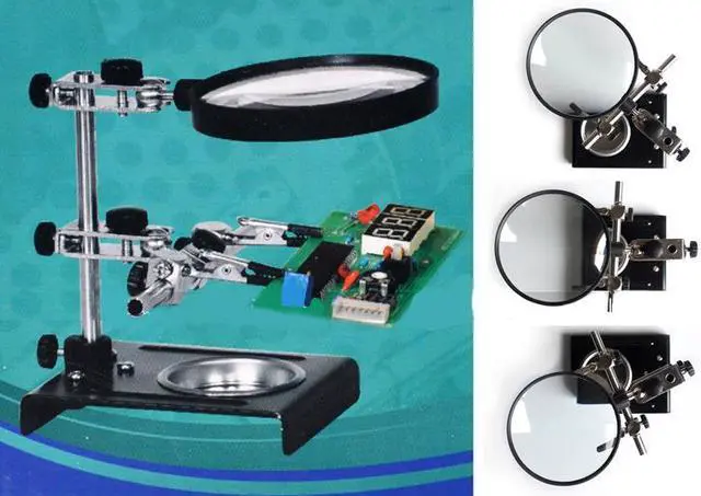 SY-209 Desk Magnifier Soldering Iron Stand Helping Clamp Vise Clip Tool 3X Magnifying Glass Adjustable Model No.:SY-290APacking: BoxGlass diameter:9cmMagnification:3XType:Universal