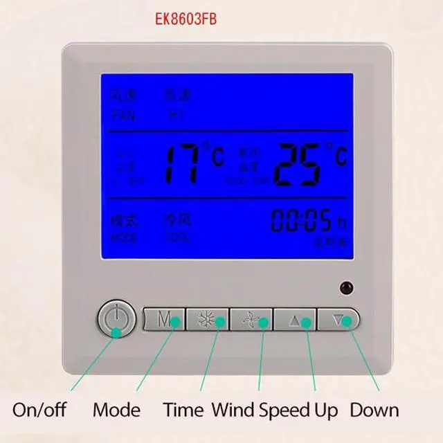 Package includes: 1*Temperature controller panel 2*screws 1*user manual Operation instructions: Press to turn it on, it will show the current termperature of the room. Press it one more time, the controller will be turned off.When the controller is power onpress to increase the temperature, press to down the temperature. The change value will be 1.This product is for Central air-conditioning temperature controller, it is not for floor. You can press"M" button to switch the mode, if it shows"cool", it will be cold wind, if it shows" warm", then it will heat your room. The backlight will be off after 5 seconds.
