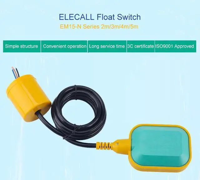 ELECALL Water Level Controll Liquid Float Switch Contactor Sensor 3m Cable Rated voltage: 220VRated current: 4AWorking temperature: water temperature should be between 0 centi-degree and 65 centi-degreeMechanical endurance: 100,000timesPower range:500WWorking pressure:0.1MPaControl range:>0.3MProtection class: IP65Cable length: 2m/3m/4m/5mDiameter of the wire:0.4mm2