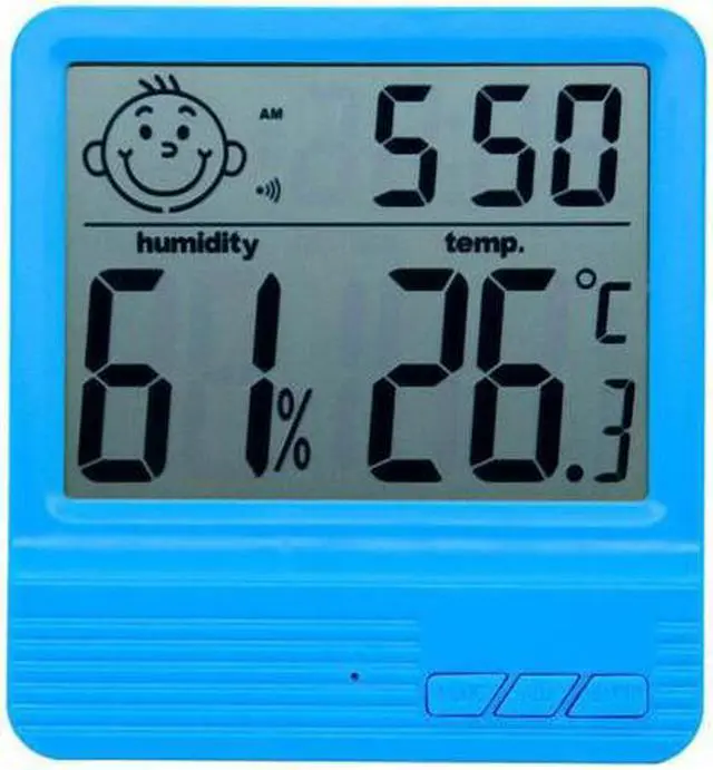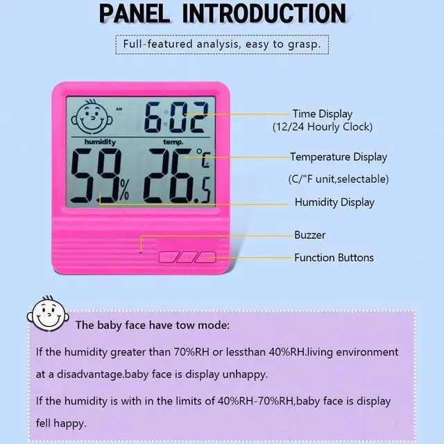 Please Note:Not included battery 1.General Description: * This is a Temperature & Humindity Meter * large character LCD display * multi-function * low power consumption * high stability & accuracy 2.Features: * Display temperature,humidity and time simultaneously * memory of MAX & MIN measuring value * 12 hour/24 hour displaying system selectable * C/F unit,selectable * integral hour alarm function * Alarm function * Clock & Calendar function( month and date ) * Desk-top placing or Wall Hanging 3.specification: * Temperature range : * temperature: -50~ +70C(-58~ +158F) * humidity range: 10%~99%RH * Resolution : Temperature: 0.1C (0.1F ) Humidity: 1%RH *Accuracy : Temperature :+/-1C( 1.8F) Humidity: +/-5%RH 40%~80%) *product dimension :98x 106x22mm *Power supply:1*1.5V( AAA size) (Not included) *weight Approx :160g *storage condition: 20C~60C,20~80%RH MADE IN CHIN 4.BABY FAC Eexpression Feel happy / unhappy The baby face have tow mode If the humidity greater than 70%RH or less than 40%RH.living environment at a disadvantage.baby face is display unhappy,if the humidity is with in the limits of 40%RH-70%RH,baby face is display fell happ.