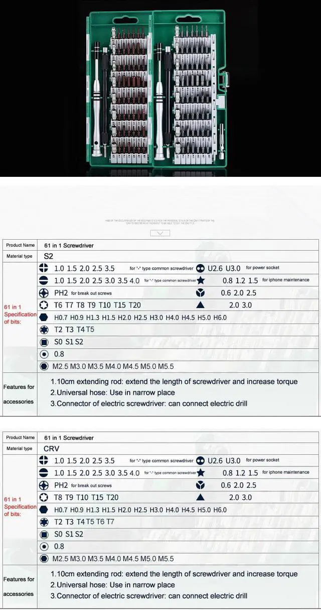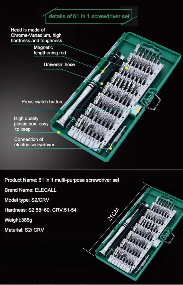 ELECALL 61 in 1 CRV Screwdriver Bit Magnetic Driver Kit Precision Screwdriver set Hand Tools for Phone Electronics Repair Tool Kit Brand Name: ELECALL Screw Head Type: Slotted,Hex,Y-Type,Triangle,Phillips,Torx,H-type Model Number: 61 in 1 Type: Screwdriver Set Magnetic: Yes Material: Chrome-vanadium Steel Features: Multifunctional,Mini,Dismountable,Non-slip,Insulated With Handle Or Not: Yes Screw Head Type: U-type