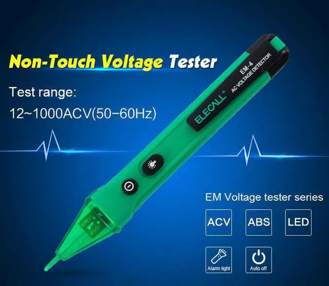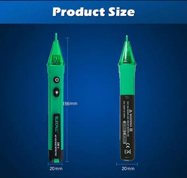 ELECALL Name Non touch Voltage test pencil Model EM-4 Voltage test range 50-1000ACV(50-500Hz) International Safe Standard EN61010-1/600VCAT III Work Temperature -10-50C Storage Temprature -20-60Degree Humidity <8s%RH Battery 2*1.5v(AAA Type) Size 146*25*22mm Weight 26g Non-contact test pen, safe, convenient to use. Pen clip design, portable for use. Wide AC voltage range: 50-1000V With High accuracy resistance inside Translucent pencil head with LED The red light will be flash and the item will alarm when detect the electric With Auto-off Function