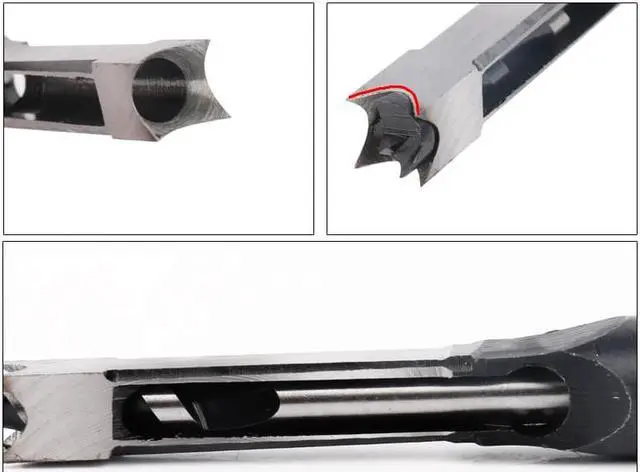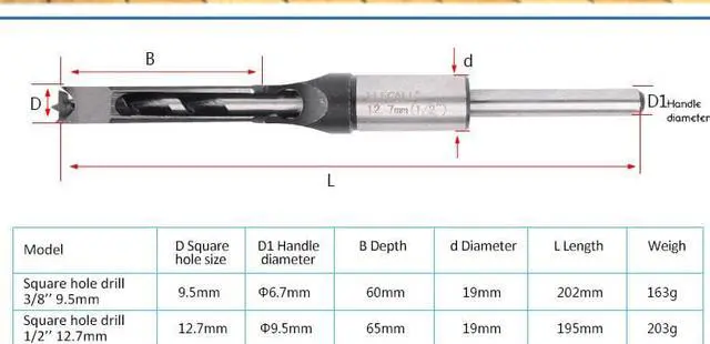Model D Square hole size D1 Handle diameter B Depth d Diameter L Length Weight Square hole drill 3/8'' 9.5mm 9.5mm 6.7mm 60mm 19mm 202mm 163g Square hole drill 1/2'' 12.7mm 12.7mm 9.5mm 65mm 19mm 195mm 203g Woodworking square hole drillSquare hole drill can not be used on an electric drill, drill square holes need to fit a square hole drill drilling (mortise and tenon machine) to use. Mortise and tenon square hole drilled by the terrible + outer sleeve in the middle of the combination.Reduce labor intensity of construction workers, speed up the construction speed, reduce construction costs for construction, installation, renovation, decoration industries.Use matters: Square hole drill is mainly used for woodworking aspects. Various existing bits, can only process a circular hole, square hole can not be processed, to machining square hole, must drill the hole or cutting machine processed crude hole, then chisel made from artificial hand. The utility model in the hole drilled by the rotary body, while the impact of the use of hammer impact force transmitted to the outer body, the material crushing round hole and square head wall, a one-time processing of a square hole, and the dust can be broken slag discharged from the tube. Using different specifications of the square hole drill, matching the appropriate power of the square hole machine, you can play a square hole to meet the requirements.