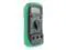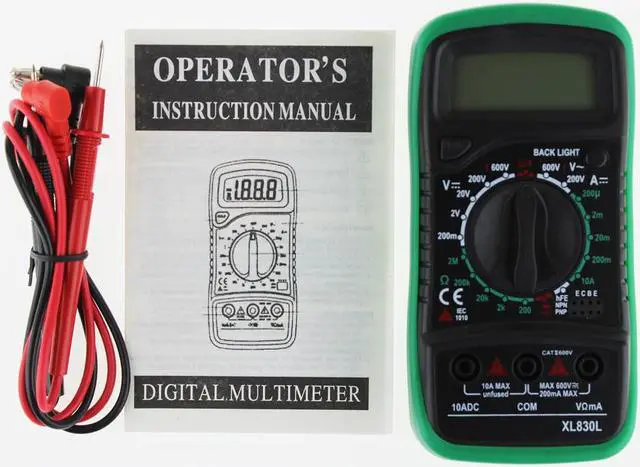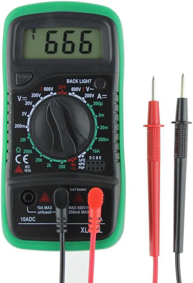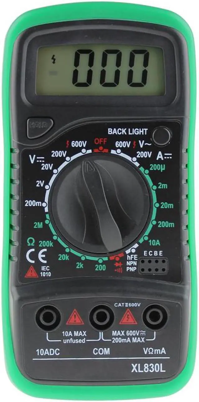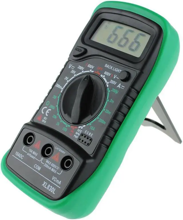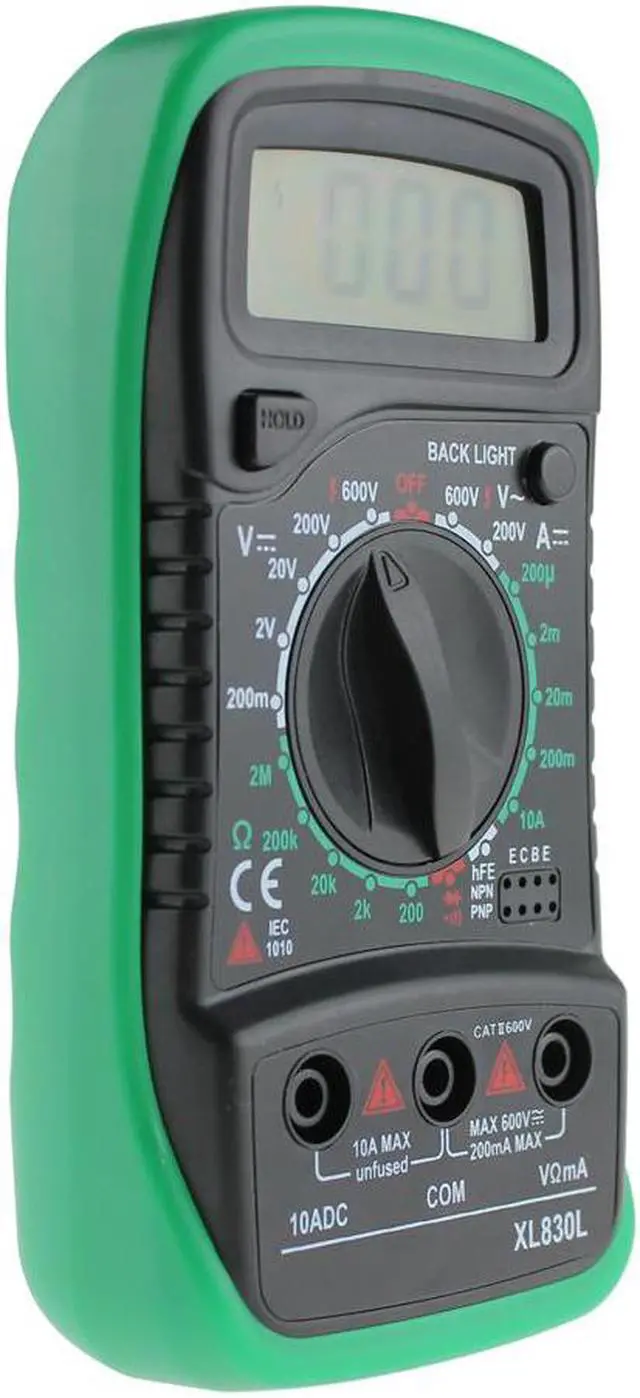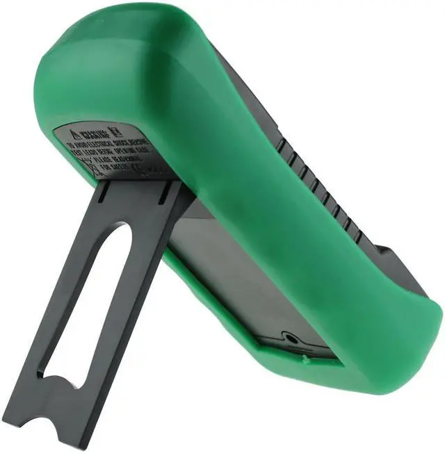 Specifications: DC Voltage 200mV/2V/20V/200V/600V(0.5%) AC Voltage 200V/600V(1.0%) DC Current 200A/2mA/20mA/200mA/10A(1.0%) Resistance 200/2k/20k/200/2M(1.0%) TriodeMeasurement Yes (PNP/NPN Triode hFE) Diode Measurement Yes Input Resistance 1M Battery Type 9V, 6F22 (NOT included) Max. Display 1999 Display Size 45 X 20MM Color Green Dimensions 145 x 70 x 40mm Weight 129g Features: - Overload Protection on all ranges - Housed in a rugged rubber boot with integral stand - Low Battery Voltage Indication - Portable & Compact Design - Data Hold Function & Diode Test Facility - 20 Position Rotary Switch - Removable Thick rubber casing protects Multimeter from splashes & Minor Bumps -Measures AC & DC Voltage, DC Current, Resistance, Audible Continuity, Diode/Transistor Verification Mode