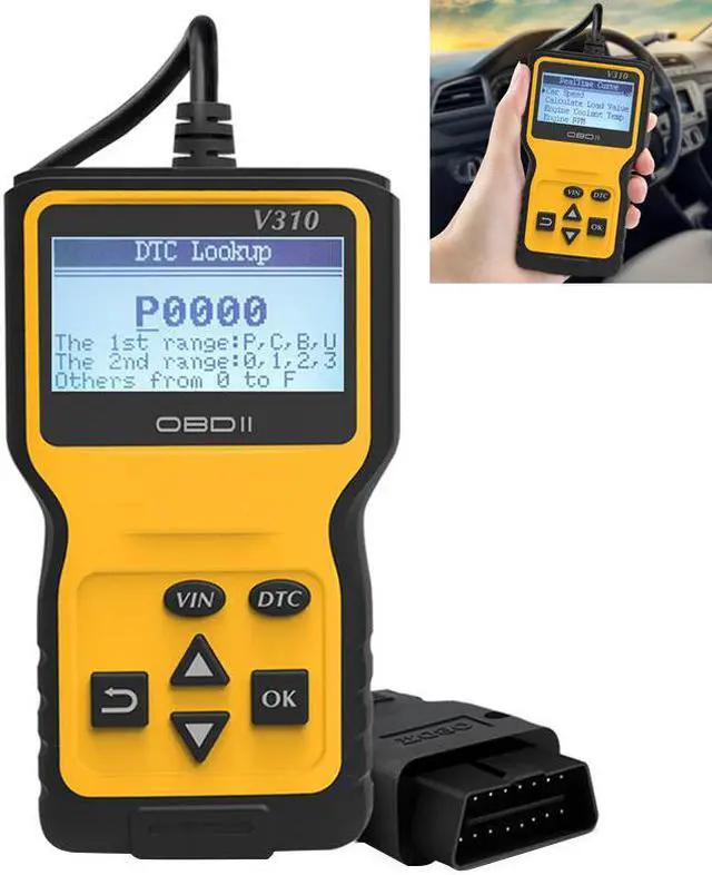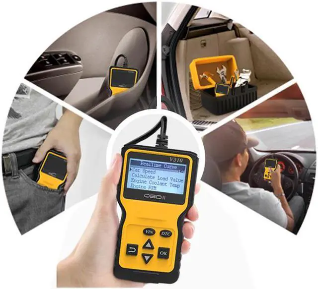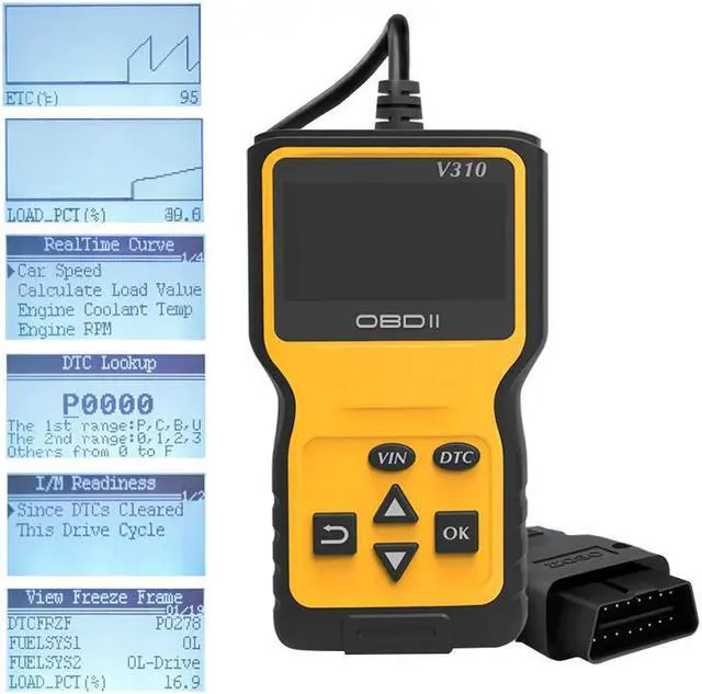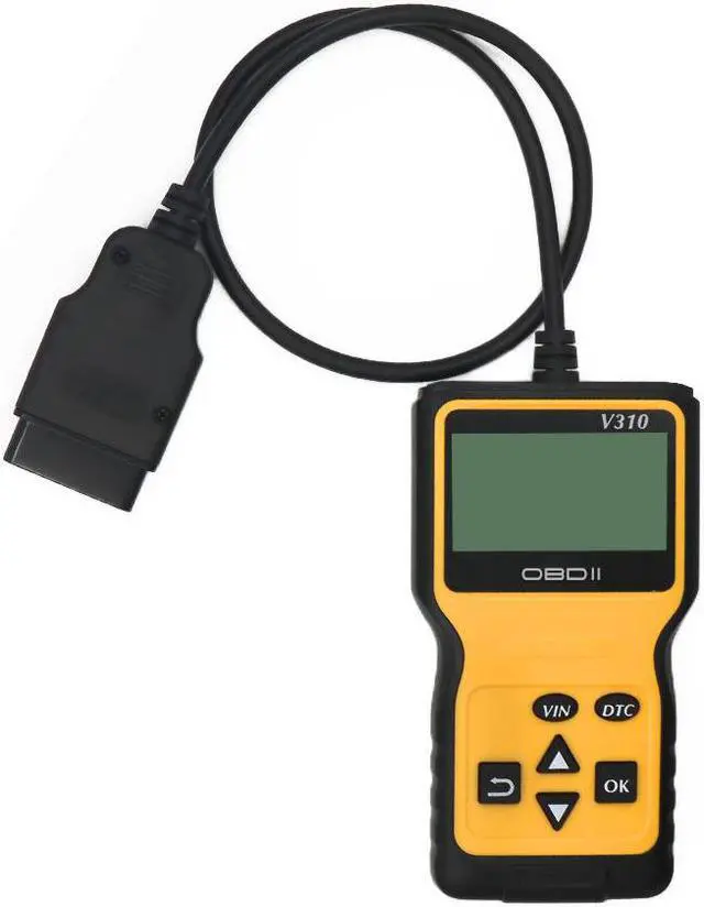 Matters Needing Attention: 1. Do not use abrasive cleaners to clean up this product. 2. Never allow the product to be exposed to sunlight for a long time. 3. Do not allow the product to be heated or near the source of fire, such as cooking stove. 4. Do not attempt to make any changes to the product since it does not contain any maintenance. 5. Do not use this product in the rain. 6. If you do not intend to use this product for a long time, please store it in a dry environment to avoid extreme temperature and dust. OBDII Supported Protocol: 1. SAE J1850 PWM (41.6Kbaud) 2. SAE J1850 VPW (10.4Kbaud) 3. ISO9141-2(5 baud init, 10.4Kbaud) 4. ISO14230-4 KWP (5 baud init, 10.4 Kbaud) 5. ISO14230-4 KWP (fast init, 10.4 Kbaud) 6. ISO15765-4 CAN (11bit ID, 500 Kbaud) 7. ISO15765-4 CAN (29bit ID, 500 Kbaud) 8. ISO15765-4 CAN (11bit ID, 250 Kbaud) 9. ISO15765-4 CAN (29bit ID, 250 Kbaud) Package Weight : 332 G / 11.71 Ounces Package Dimensions (L*W*H) : 225*105*26 MM / 8.86*4.13*1.02 Inches Retail Packaging: Yes, Blister Packaging Product Model: V310 Product Type: Automobile hand-held fault diagnosis instrument Storage Temperature: -30 ~ 55 Hardware Version: V1.1 Working Voltage: DC 9~16V Working Current: 80mA OBD Interface: 16 PIN Features: - Support 5 languages (German, Dutch, English, Spanish, French) - Read vehicle fault codes - Clear the error code and turn off the MIL ("Check Engine" indicator) - View Freeze Frame - I/M ready - Access to vehicle information - data flow - Real-time curve - Getting Speed Information - Calculating load values - Engine coolant temperature - Obtain engine tachometer - Frame number one-click query - Fault code one-click query