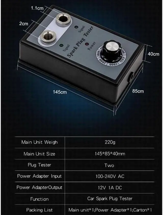 Car Spark Plug Tester Using Note:1. Please Turn Off Power before you place spark plug2. The Spark Plug Tester is a high-voltage detector, so do not touch spark plug with hand at work to avoid danger.Car Spark Plug Tester User Manual:1.Place the Spark Plug into tester hole 1 or 2; If you want to compare the new spark plug and old one, place new spark plug into hole 1 and the old on into hole 22.Connect to power supply3.Turn the key switch 4 clockwise to turn on tester, indicator 3 will light up, tester is now working at 1000rpm/min.4. Again turn the key switch 4 clockwise,you can adjust the working frequency between 1000rpm to 5000rpm/min.The higher the frequency, the stronger the spark strength.Gasoline Car Spark Plug Tester Product Parameters:Main Unit Size:145*85*60mmMain Unit Weight:220G( Not including Power Adapter)Power Adapter: Input 100-240V AC / Output 12V 1A DC Dual Hole Car Spark Plug Tester Detector have two testing holes, you can test two spark plugs meanwhile and and if you suspect any spark plug works improperly you could compare and test to make accurate judgment.To Test spark plug performance and ignition strength, apply to 12V Gasoline vehicles car spark plugs.Adjustable double hole car spark plug tester detector Ignition Plug Analyzer Diagnostic ToolCar Spark Plug Tester Detector with Dual Hole Advantage:Dual Hole Car Spark Plug Tester Detector have two testing holes, you can test two spark plugs meanwhile and and if you suspect any spark plug works improperly you could compare and test to make accurate judgment.Usage: Test spark plug performance and ignition strengthApplication Range: 12V Gasoline vehicles car spark plugsCar Spark Plug Test principle:In automobile ignition system, the high-voltage ignition coil generates a high-voltage (10000 volts or more), and the spark plug diverts it form high -tension ignition coil into the cylinder engine, spark between the spark plug electrodes will ignite the mixture. The Detector could tell the good spark plugs from the bad by the strength of the spark.