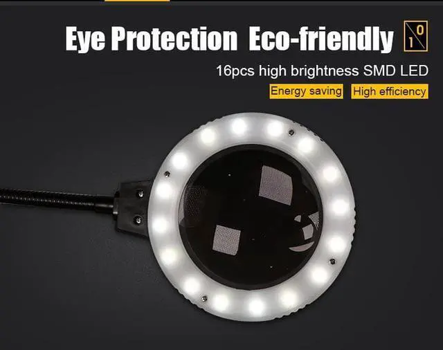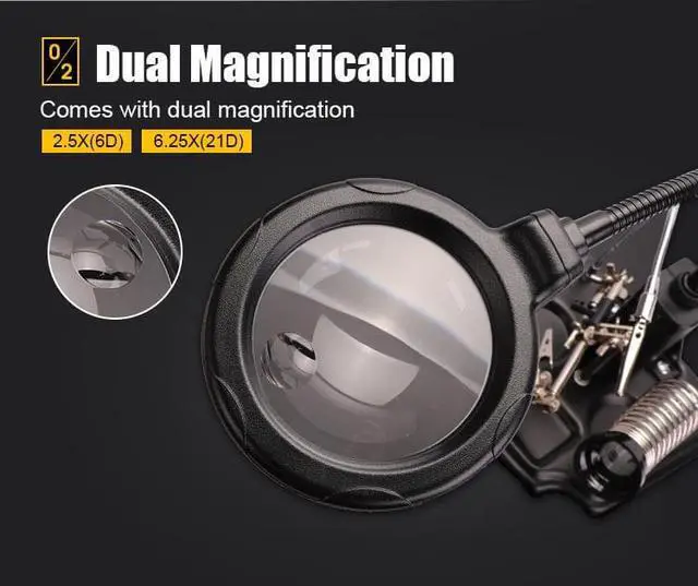 Pro'sKit SN-396 Magnifying Glass LED Lights Magnifier with Soldering Iron Stander Clamp Alligator For BGA Soldering Repair Comes with 16 SMD LEDs illuminating, energy saving and super bright. The magnifier is on a flexible neck that gives you 6D(2.5X) and 21D(6.25X) magnification for finishing those fine solder joints. The adjustable 3 helping hands clips feature precise positioning and secure gripping your work. The magnifier is powered by either 4 AA batteries or external power adapter. The set includes Solder Spool Brackets, Soldering Iron Holder, Cleaning Sponge, Brass Tip Cleaner and Solder Flux.3 helping hand clipsPowered by batteries or adapterExcellent solution for soldering work