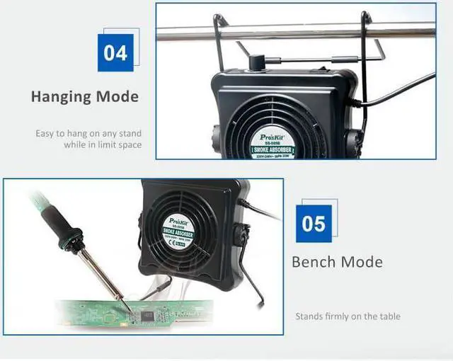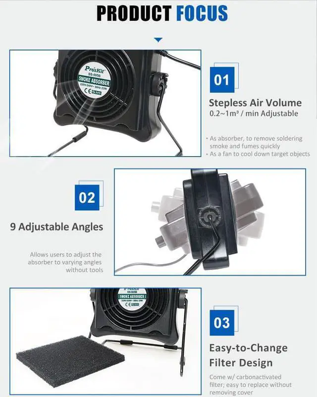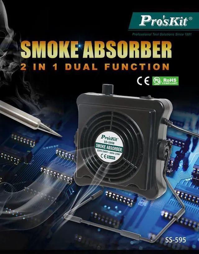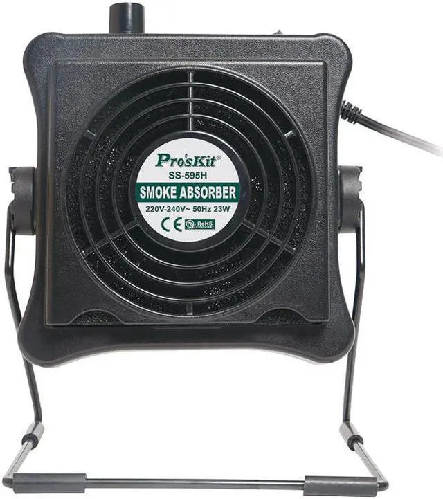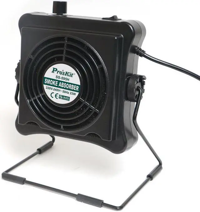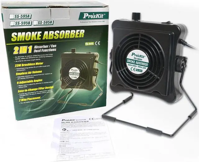 Pro'skit SS-595H 220V 23W Solder Smoke Absorber Fume Extractor Air Filter Smoke Fan For BGA soldering Rework This is an amazing smoke absorber that can effectively absorb fumes and allows you to work in a safe environment with its activated carbon filter. Absorber / Fan Dual Functions As absorber to remove soldering smoke and fumes quickly, safely and efficiently from soldering workspace. As a fan to cool down target objects.23W Brushless Motor Guarantees long service life and offers quiet work environment.Stepless Air Volume Adjustable stepless air volume from 0.2~1m3 / min as per varying requirement.9 Adjustable Angle Allows users to adjust the absorber to varying angles without tools.Easy-to-Change Filter Design Fumes are absorbed by the replaceable carbon- activated filter, its easy to replace without removing cover.2 Way Placement You can easily hang it on the top or stand on the desk.