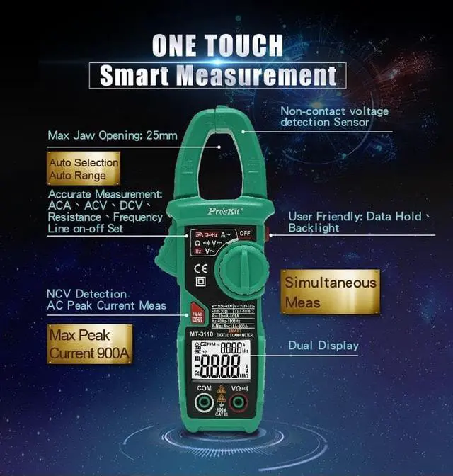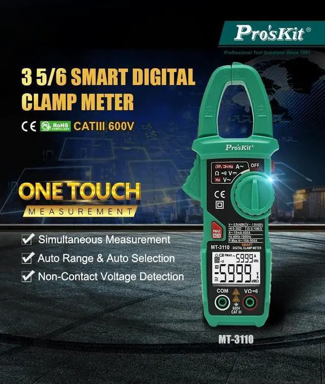 Model No.MT-3110-CAC current6A /60A/400A(2.5%+8d)600A(3.0%+10d)Peak measurements: 900A (10%+10d)AC voltage6V /60V/600V (0.8%+5d)DC voltage6V /60V/600V (0.5%+3d)resistance6K/60K/600K/6M/10M (0.8%+3d)frequency10Hz~1kHz(1.0%+5d)Contactless power test90~1000V 50/60HzOther functionsData retention, LCD , backlight,Low battery indication, automatic shutdown.AuthenticationCE CAT III 600VBattery1.5V AAAx2 (shipped with battery)size190 x 68 x 38 mm 3 5/6 Digital Smart Measurement:3 5/6 digits 5999 counts, 0.5% best accuracyAuto Selection of ACA,ACV,DCV,Resistance and FrequencyAuto Range for convenient and accurate measurementSimultaneous MeasurementDual display enables you to display frequency while measuring AC Voltage, AC current; or while measuring AC Current simultaneously measure with AC/DC Voltage and Resistance.Non contact ACV detector for AC 90-1000V AC peak current measurementDual Display with backlight allows operation in dark area. Display the results of simultaneous measurementExtra functionsAuto power off, Low battery indication, Data hold