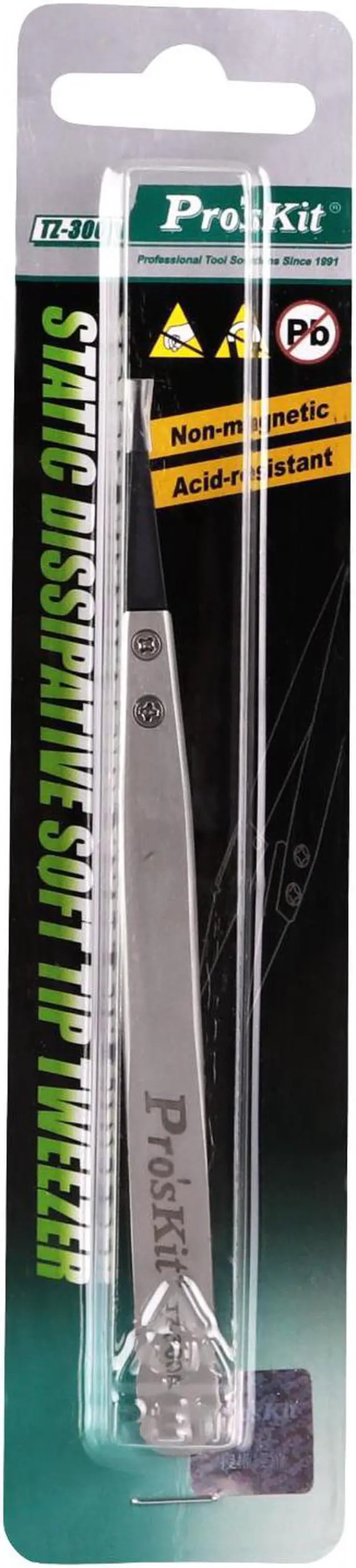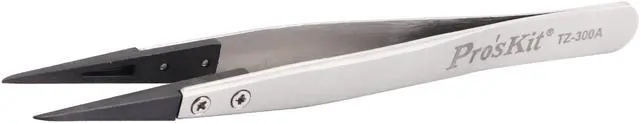 Pro'sKit TZ-300A Precision Static Dissipative Soft Tip Tweezer (Fine Tips) 130mm Antistatic Tweezer These tweezers tip is made of electrically conductive engineering plastic without magnetic offers greater strength than general-purpose plastic and safe to use for electronic parts that are vulnerable to static electricity as well as for for precise jewelry.
