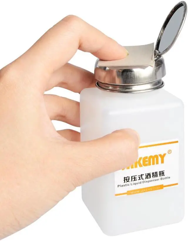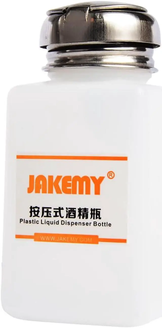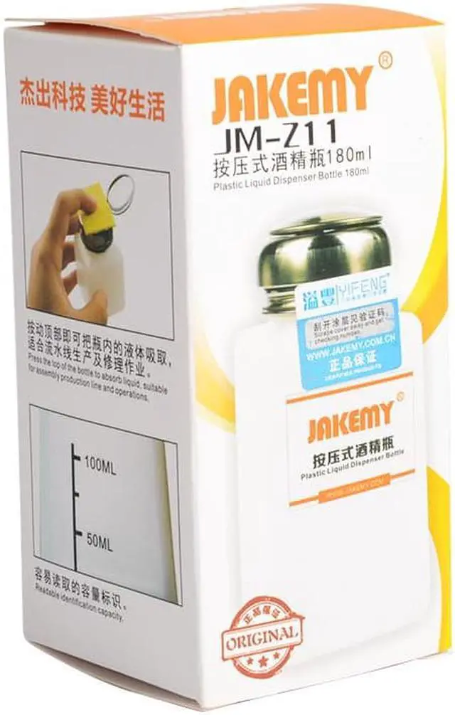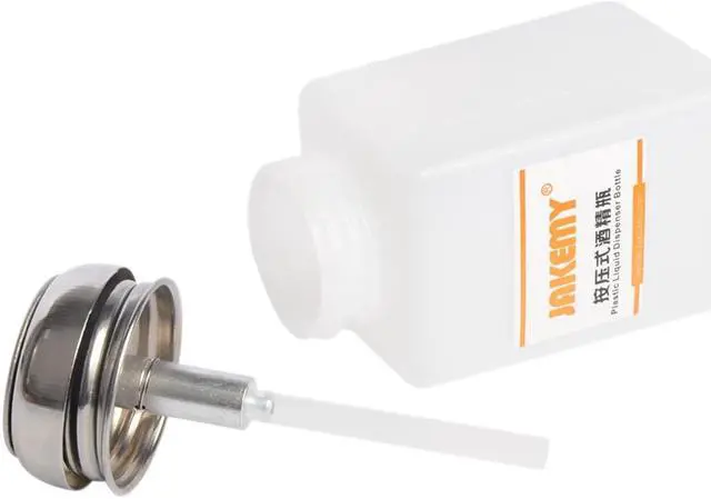 Brand: JAKEMY Model: JM-Z11 Size: approx. 11.5*5.7*5.7cm Capacity: 180ml This Anti-static Alcohol Bottle is suitable for medical, industry use. The hermetic valve can prevent the spread of virose gas in the bottle, it can protect the work environment. It can make you take out the liquid what you need, avoid volatilization and overflow and prevent the water you took out reflux in the bottle. It is anti-static. It is used for use and clean of the electronic equipment, precision machine and soldering occasion. Made of plastic and stainless steel materials.