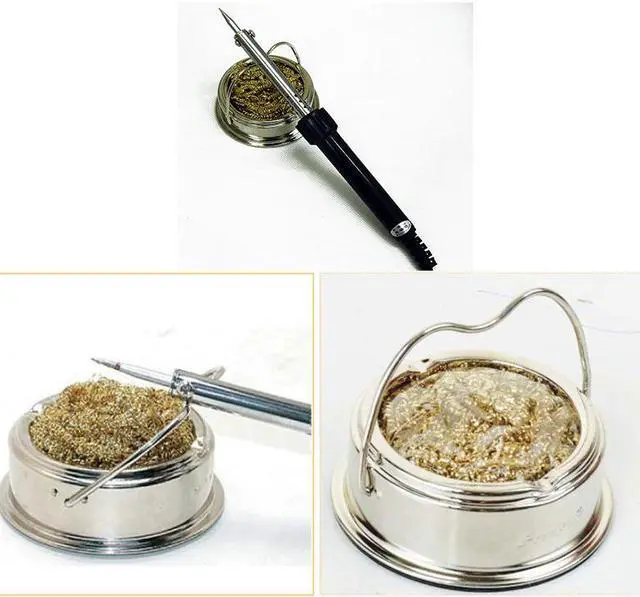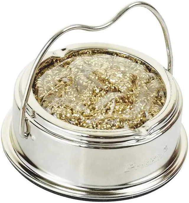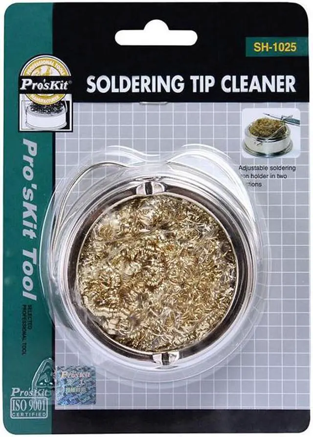 Pro'sKit SH-1025 Soldering Tips Cleaner Welding Solder cleaning Ball Holder with Steel Wire Features: Made of low abrasive brass shavings. No water necessary. No temperature drop as in conventional sponges. Cleans better than conventional sponges. Anti-slip pad.