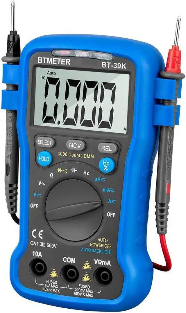 Specification3:Color:blueModel: BT-39KDC voltage range: 400mV ~ 600VAC voltage range: 4V ~ 600VDC current range: 400A ~ 10AAC current range: 400A ~ 10ACapacity range: 5.12nF~200FBattery type: 1.5V (AA) x2Item weight: 250gItem size: 150x101x37mmPackage Information:Package Size: 150x101x37mm/5.91 x 3.98 x 1.46inPackage Weight: 250g/8.82ozGeneral Box Package Features:1. AC/DC voltage, current, resistance, frequency, capacitance, temperature, battery test2. Test duty cycle3. Continuity buzzer and diode test4. Auto/manual range5. Relative ValueDescription:1. Overload protection: full range protection2. Data hold function3. Low battery display