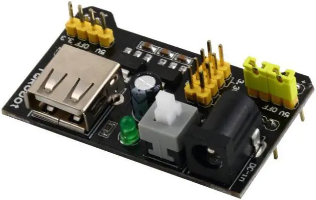 Size:53*32 mm(max)Net weight:12 gPackage weight:22 gMain Color:Black nput voltage: 6.5-12 V (DC) or USB power supplyOutput voltage: 3.3V/5V can switch overMaximum output current: <700 maFluctuation two road independent control, can switch over to 0 V,3.3 V,5 VOn-board two groups of 3.3V, 5V DC output plug pin, convenient external lead useBreadboard power supply module, compatible with 5 V,3.3 VApply to MB102 breadboard