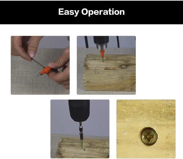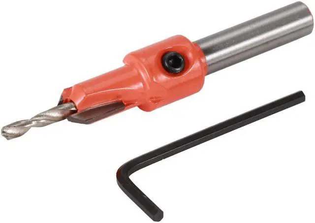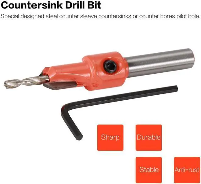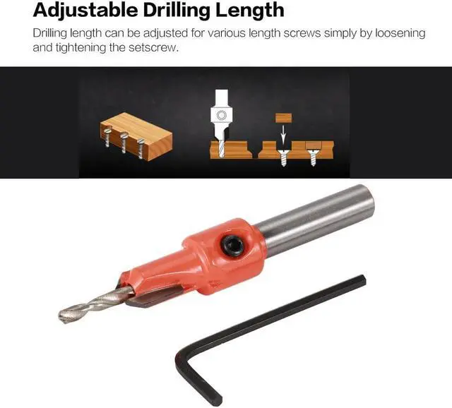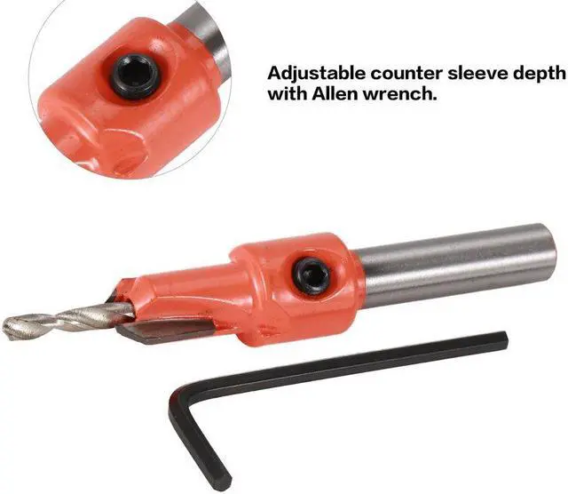 Descriptions:1.Plated surface treatment for great anti-rust.2.Widely used in woodworking.Specifications:Color:orangeMaterial: alloyDrilling bit diameter:3.5mmRod diameter:8mm Features:1. Special designed steel counter sleeve countersinks or counter bores pilot hole.2. Adjustable counter sleeve depth with Allen wrench3. Standard hex shank, quickly changing and compatible.4. Drill and countersink for wood screws without changing bits.5. Drilling length can be adjusted for various length screws simply by loosening and tightening the setscrew.
