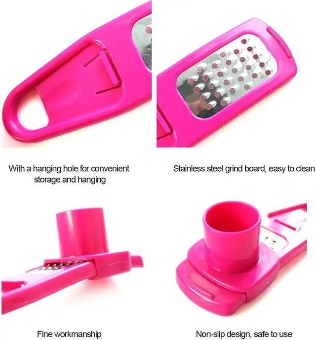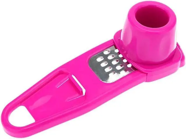 Specifications:Material: PP + stainless steelColor: green, rose red (optional)Item size: 135 * 40mm / 5.31 * 1.57inPackage size: 150 * 100 * 20mm / 5.91 * 3.94 * 0.79inPackage weight: 40g / 1.41ounce This garlic grater is a perfect tool for every kitchen! Easy to use, very practical and convenient. Perfect for grating garlic and ginger.Features:Made of fine quality PP and stainless steel material, safe, odorless and non-toxic.The stainless steel grind board makes it easy to grate garlic and ginger.The removable cover can protect your hands, safe to use.Designed with a hanging hole for convenient storage and hanging.Easy to use, saving your much time, also easy to clean.