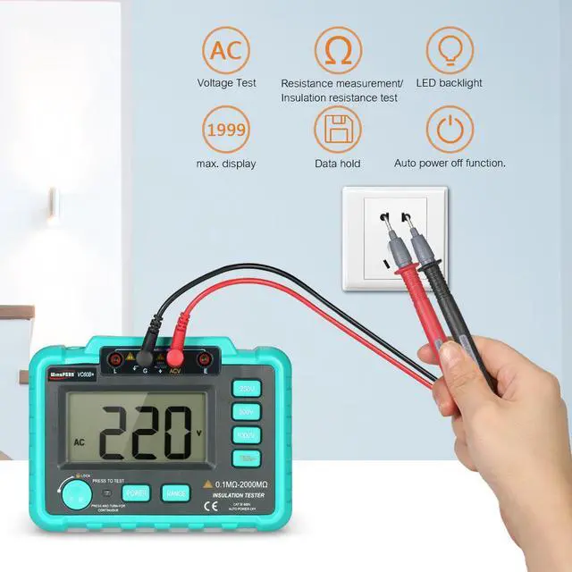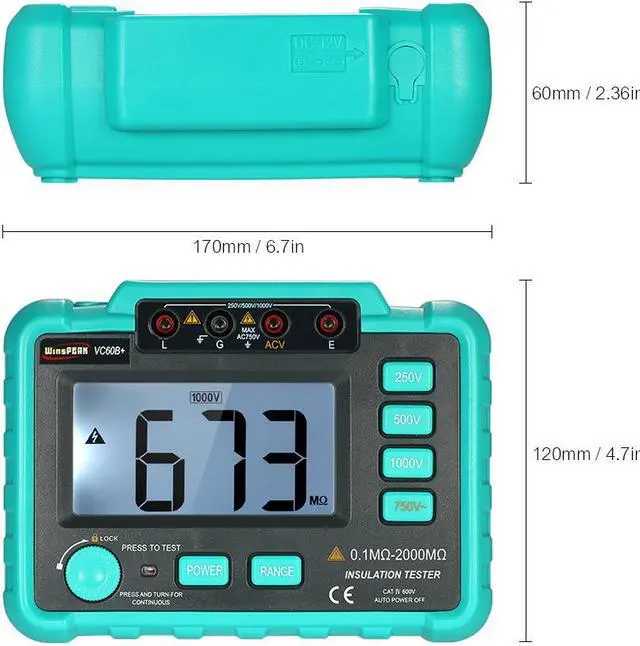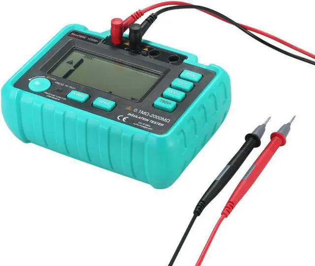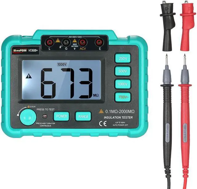 General characteristics (1)Display: 90 48mm LCD display, the maximum display is "1999". (2)Over range indication: Only the highest digit shows "1" when the upper limit is exceeded. (3)Measurement method: Double integral type A / D conversion. (4)Sampling rate: About 3 times /second. (5)Power supply: 5 # battery LR6 (1.5V) 8 (with external power adapter) .It contains lack of voltage indication when the voltage is not enough. With automatic shutdown function (only for MAX DC1000V OUT function, about 15 minutes after machine start). (6)Power consumption: Power consumption of empty load test <300mw. (7)Using environment: Temperature 0 -40 , humidity 30% RH-85% RH. (8)Dimensions:175(L)x110(W)x70(D)mm. (9)Weight:750g(NOT Battery included). (10)Attachment: 1 no Manual, 1 no Insulation meter, 1 no certificate, 1 no package box, one pair of 10A testing pen (60B +), one pair of crocodile clip ) Median resistance 250V/500V : 2 M 1000V: 5M Voltage measurement AC750V (1% readings+6 unit) Hole plug position Insulation resistance: L.E AC750V: ACV G AC750V Input resistance: 1M. AC750V Frequency response:(50200)Hz Note:Median resistanceEnsure that the measurement two end voltage is not lower than the lower limit of the resistance measurement of 90% of the nominal value of the test voltage.