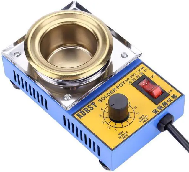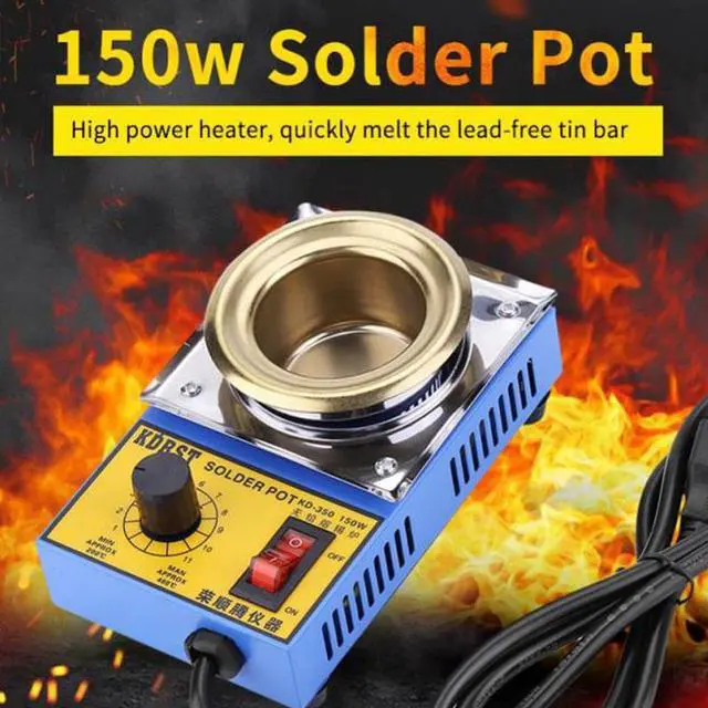 Specifications:Material: Stainless steel + titanium platePower:150WTemperature Range: 200-480Melting Time: Approx. 8 minutesCapacity: 500gSlot Diameter: 50mm/1.97inNote:1. This product must be grounded. Improper installation of the grounding must be prohibited.2. Position the control dial to high range when you start to use the solder pot, and then place the dial to the grade of auto-temperature after soldering. 3. The general working temperature of molten solder in the solder pot is 300-350 (around grade 4-grade 9). The temperature of melted solder shouldn't be too high, or it will cause the aging of solder pot, the darkening or yellowing of melted solder. 4. When highly acidic scaling powder is applied, the solder pot is more likely to be corroded or perforated under extraordinarily high temperature. 5. The power must be turned off before leaving to avoid accidents Description:Solder Pot has the advantages of small size, easy placement, large temperature adjustment range, automatic constant temperature, high accuracy, low power consumption, energy saving, rapid heating, and long service life. It is widely used in transformers, coil pin tin plating, electronic transformers, electronic wire production, etc.Features:1. Electronic temperature control plate, adjustable temperature and automatic constant temperature.2. Easy to use and maintain, excellent heat effects.3. The furnace is made of high quality stainless steel plate, heatproof, solid and durable4. The temperature can reach up to 480, quickly melting tin.5. Widely used in transformers, coil pin tin plating, electronic transformers, electronic wire production, etc.
