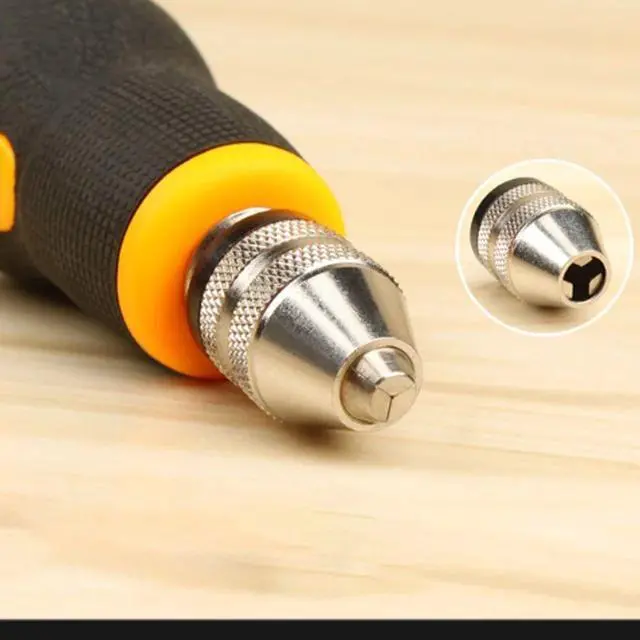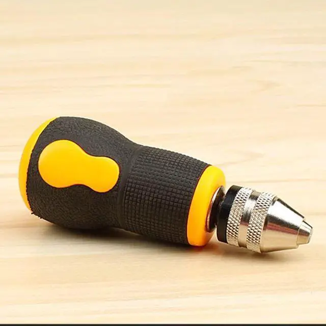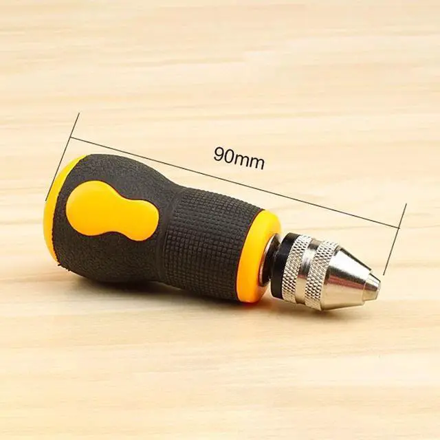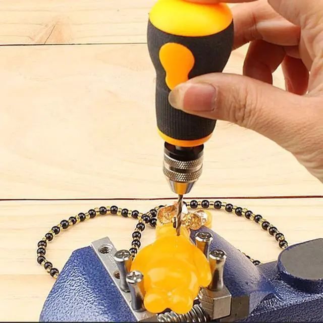 Specifications:Material: PVC+rubber+carbon steelColor: yellow+black+silverChuck clamping range: 0.5-3.2mm / 0.02-0.13inTwist drill bits quantity: 10pcsTwist drill bits size: 0.8/1.0/1.2/1.5/1.8/2.0/2.2/2.5/2.8/3.0mmHand drill length: 90mm / 3.5inHand drill weight: 80g / 2.8ouncePackage size: 120 * 60 * 35mm / 4.7 * 2.4 * 1.4inPackage weight: 100g / 3.5ounceNote:1. Not suitable for hard materials such as agate jade, metal, steel plate, etc.2. Please wear protective accessories to refrain accidents when using.3. Please keep the direction of force always vertical and rotate evenly, otherwise it will be easy to break the drill bit.4. Please remove the drill bit and store it after use. Made of fine quality material, practical, easy to operate and use, wide application range, has a long service life.Features:Specially designed non-slip short handle, greatly reducing the overall length, easy to hold, not easy to break the drill bit.The precise chuck is practical, does not drop drill bits, does not slip.The chuck can hold 0.5-3.2mm drill bits.Compact and lightweight, easy to use and carry.Suitable for manual drilling for small holes in wood, bodhi, bone horn, amber, olive nucleus, walnut, plastics, etc.