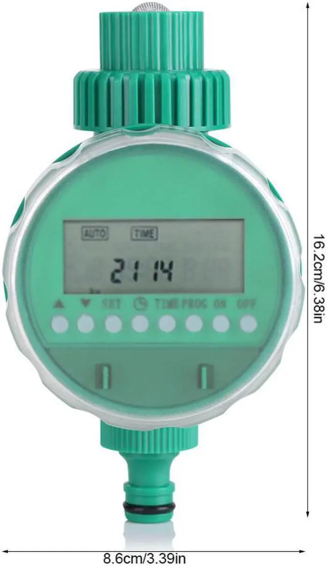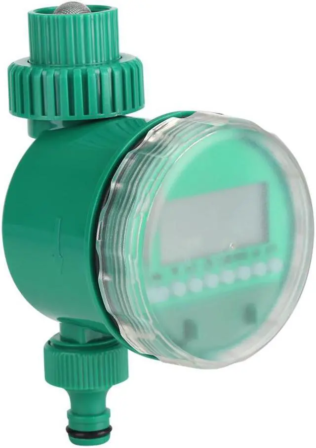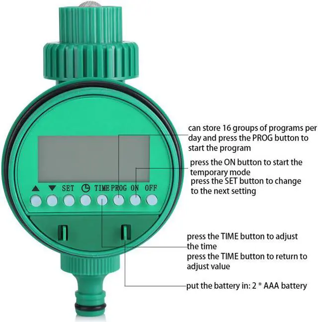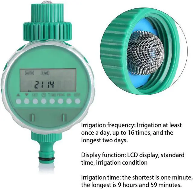 Specification:Condition: 100% Brand NewMaterial: ABSColor: Green as PictureBatteries: 2 x AAA batteries (Not included)Suitable Water Pressure: 0-400KPAIrrigation Time: shortest 1 min, longest 9 hours 59 minIrrigation Frequency: at least once a day, up to 16 times, and the longest for two daysProduct Size: Approx. 162 x 86mm / 6.38 x 3.39inchPackage Weight: Approx. 280g Watering a large area of plant everyday is really tiring. This automatic electronic irrigation timer is of great use for watering home garden planting especially suitable for the people are not at home or too busy to take care of their family garden. Mainly adopts quality plastic, high quality and durable. Intelligent flowers watering timer, the standard clock time, you can set the watering time for your garden when you are not at home. Very practical and can be applied in your home garden, roof garden, lawn, balcony, courtyard etc. With this irrigation, you can now maximize the efficiency of your irrigation system. Practical product at good price, worth buying.Features: Automatic & intelligent: with a timer, you only need to press the buttons to set the irrigation time and it will water the plants on time. Multi-functional LCD screen: displays day of the week, hour, minute and programming time for easy reference; buttons for easy setting and re-setting. User-friendly: 16 groups of watering time can be set per day at most; different programs for your special demands: single and multi program, regular and cycle, program of one day or several days. Versatile use: suitable for the control of irrigation systems in the domestic sector, such as lawn sprinkler, sprinklers, greenhouse and more. Battery powered: only 2 AAA batteries required; not tethered to socket, you can use it any corner in your garden.
