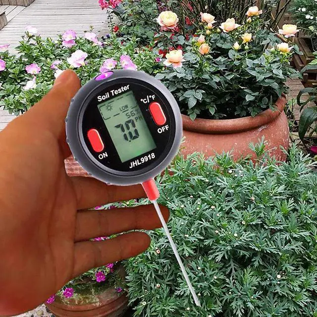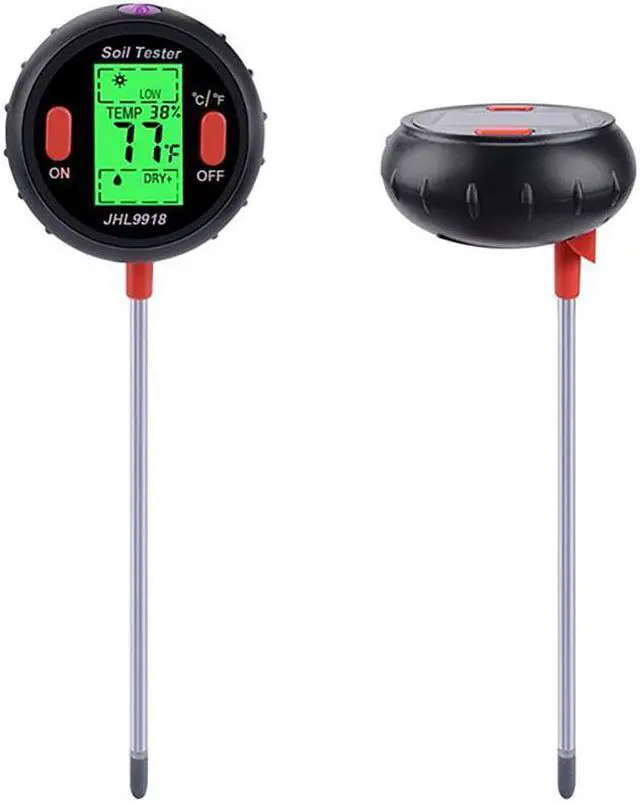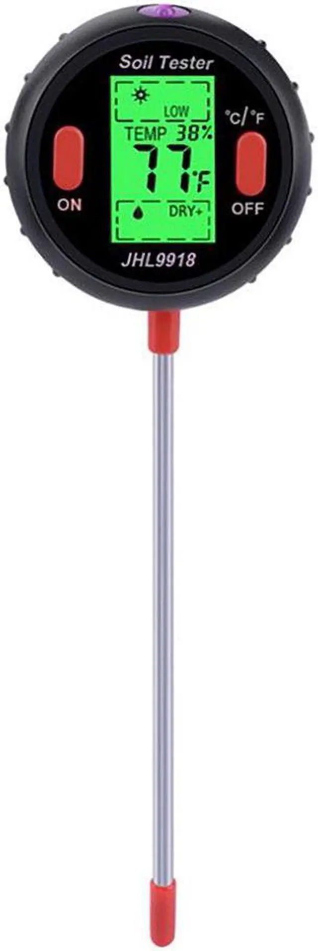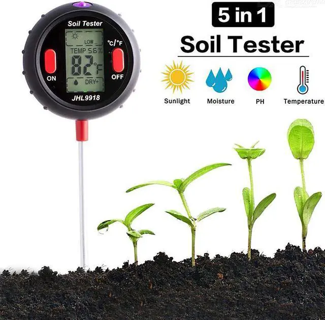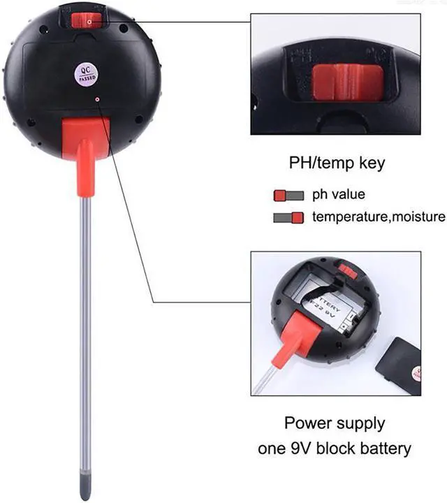 5-in-1 Digital Soil Tester Temperature Environmental Humidity Lighting pH Soil Moisture Garden Measuring Tools pH Range: 3.5-9.0Probe Length: 8.29 Light Levels: LOW-, LOW, LOW+, NOR-, NOR, NOR+, HGH-, HGH, HGH+5 Moisture Levels: DRY+, DRY, NOR, WET, WET+Temperature Range: 16-122F (-9~+50C)Power Supply: 9V batteryHumidity: Its the amount of water vapor in the air relative to the maximum amount of water vapor that the air can hold at a certain temperature. The ideal humidity range for most healthy plant growth is 40-60%