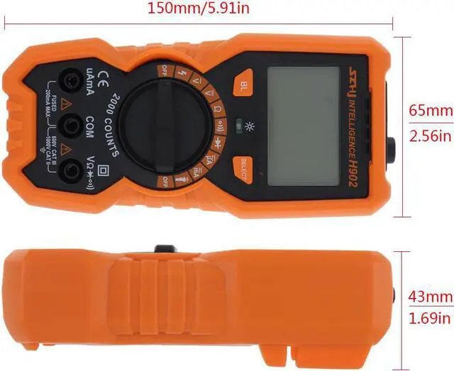 High Precision Intelligent Multi-function Digital Multimeter Handheld Portable Home Instrumentation Specifications: Product Name: Digital Multimeter Mode of Operation: Manual Range Backlight Display: yes Protective Settings: Protective Cover Product Use: Ideal for school, machine repair, communication, power, circuit equipment maintenance and repair. DC voltage: 200mV/2V/20V/200V/1000V/2000V AC voltage: 200mV/2V/20V/200V/750V DC current: 2 mA / 20mA / 200mA / 20A AC current: 20mA/200mA/20A Resistance: 2000/2kQ/20kQ/200kQ/2M2/20MQ/200MQ Capacitance: 20nF/200nF/2F/200F Test Environment Crystal Triode: Display range: 01000 Lbol0A hFE test Vbe2.8V Diode test: Display diode forward voltage approximation Forward DC current: about 1mA Reverse DC voltage is about 2.8V buzzer on and off Beep on and off: When the on-resistance is < about 500, the buzzer sounds inside the machine. Display resistance approximation The open circuit voltage is approximately 2.8V. Note: Working temperature: 0C to 40 C, relative humidity <80% Package Weight : 275 G / 9.70 Ounces Package Dimensions (L*W*H) : 165*95*45 MM / 6.50*3.74*1.77 Inches Retail Packaging: Yes, Colored Box