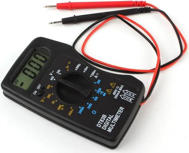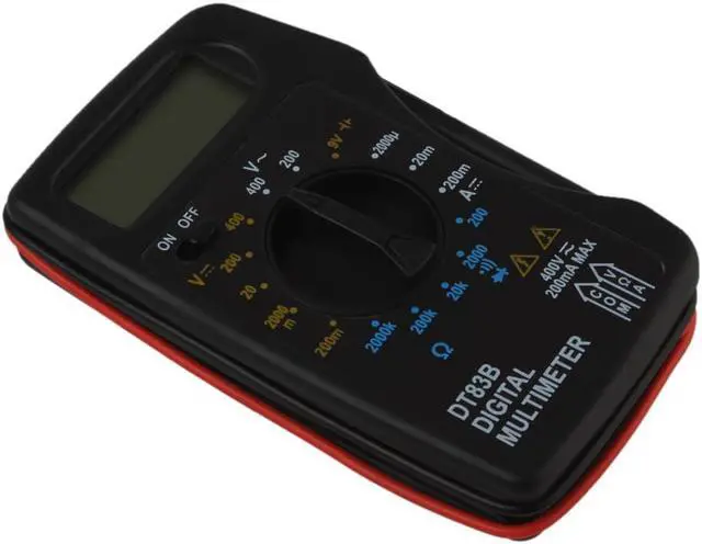 DT83B Digital Multimeter with Buzzer DC AC Ammeter Voltmeter Resistor Ohm Pocket Features: - Overload Protection - Symbol indication of low voltage - Continuity test and Diode test - Capacitance Tst - 35x14mm screen, maximum display 1999 Product Name: Digital Multimeter Product Model: DT83B Measurement Range: - DC Voltage: 200mV-2000mV-20V-200V-400V 0.5% - AC Voltage: 200V-400V 1.0% - DC Current: 2000uA-20mA-200mA 1.8% - Resistance: 200-2000-20K-200K-2000K 1.0% Power Supply: 12V battery Maximum Display: 1999 Battery Capacity Test: 9V Package Weight : 79 G / 2.79 Ounces Package Dimensions (L*W*H) : 102*60*24 MM / 4.02*2.36*0.94 Inches Retail Packaging: Yes, General Box