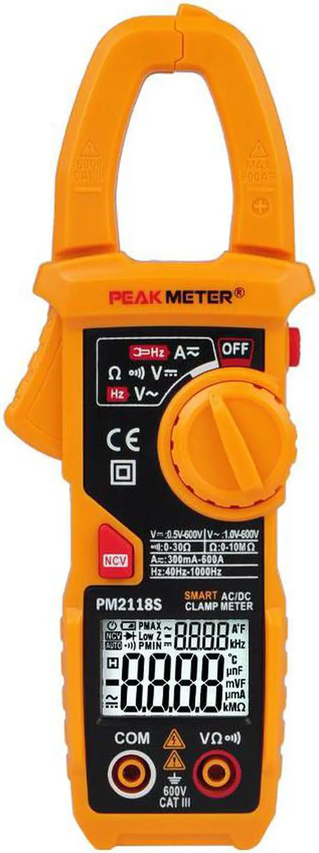 Specifications Range Accuracy DC Voltage 0.5~600V (0.5%+3) AC Voltage (40~65Hz) 1.0~600V (0.8%+5) Resistance 0~10M (0.8%+3) Continuity <30 <30 AC Current (40~65Hz) 300mA~400A 400A~600A (2.5%+5) (3.0%+5) DC Current 300mA~400A 400A~600A (3.0%+3) (3.5%+3) Frequency 40Hz~1000Hz 1%rdg Features Display 6000 counts Range Auto ACA (AC+DC) 60A/600A DCA 60A/600A DCV 600mV/6V/60V/600V ACV (AC+DC) 6V/60V/600V Continuity Yes 6k/60k/600k/6M/10M V//A Auto Scan Yes Frequency (Clamp) 1KHz Frequency (Voltage) 1KHz Data hold Yes Backlight Yes NCV Yes Low Battery Indication Yes Auto Power Off Yes Dual Display Yes General Power supply 2 x 1.5V AAA Battery Weight Approx. 250g Size 187 x 65 x 38mm Jaw Size 24mm Safety Rating EN61010-1,-2-030, ENG61010-2-032 EN61326-1, CAT.III 600V This Smart AC/DC Clamp multimeter is an innovative, which is breaking through the traditional clamp Multimeter type, it is a revolutionary product of measurement tools, which is a unique type prior to the world's major instrument manufacturers.The product features possess current measurement and simultaneously display the current frequency. voltage measurement with frequency display, voltage and current can be measured at the same time, the display screen shows the voltage and current