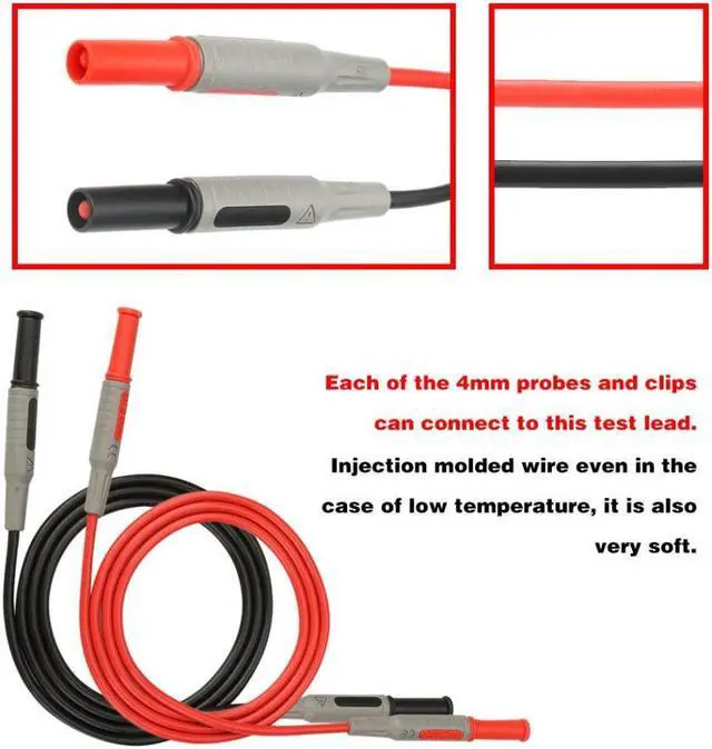Specification:Model: P1032Material: Copper, ABS, PAVoltage: 1000VCurrent: 15ABanana Plug Diameter: Approx. 4mmLength: Approx. 100cm/3.3ftWeight: Approx. 78g / 2.8oz Features: Banana plug has standard protective cap. Anti slip design and feels better. Applied double-insulation and made with flexible silicon leads for a more secure, reliable. Each of the 4mm probes and clips can connect to this test lead. Injection molded wire even in the case of low temperature, it is also very soft.