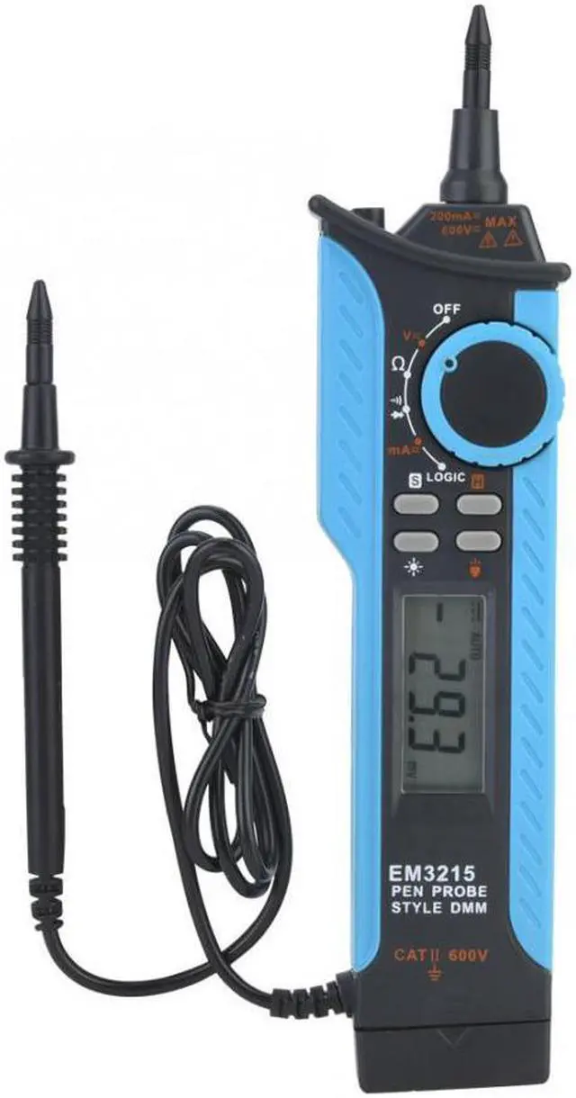 Specification:Model: EM3215Logic: High&;2.3V, Low<0.8VVoltage DC: 200m/2/20/200/150VVoltage AC: 2/20/200/150VCurrent DC: 20-200mACurrent AC: 20-200mAResistance:200/2k/20k/200k/2M/20MDiode Check:1.5V/1mAPower: 9V 6F22 battery (NOT included)Size: 57 * 230 * 30mm / 2.2 * 9.1 * 1.2in Overview:The EM3215 instrument is a compact 3 1/2-digit autorange digital multimeter for measuring DC and AC voltage, DC and AC current, resistance, diode, continuity and logic level. It has the functions of polarity indication, data hold, overrange indication, backlight, auto power-off, and flashlight. It can be operated easily and is an ideal measurement tool.Features: EM3215 instrument is a compact 3 1/2-digit autorange digital multimeter. Used for measuring DC and AC voltage, DC and AC current, resistance, diode, continuity and logic level. It has the functions of polarity indication, data hold, overrange indication, backlight, auto power-off, and flashlight. High efficient, quick and accurate. LCD display provides clear readings. Easy to operate. It is an ideal instruments for use in fields, laboratory, workshop and home applications.