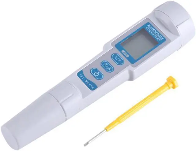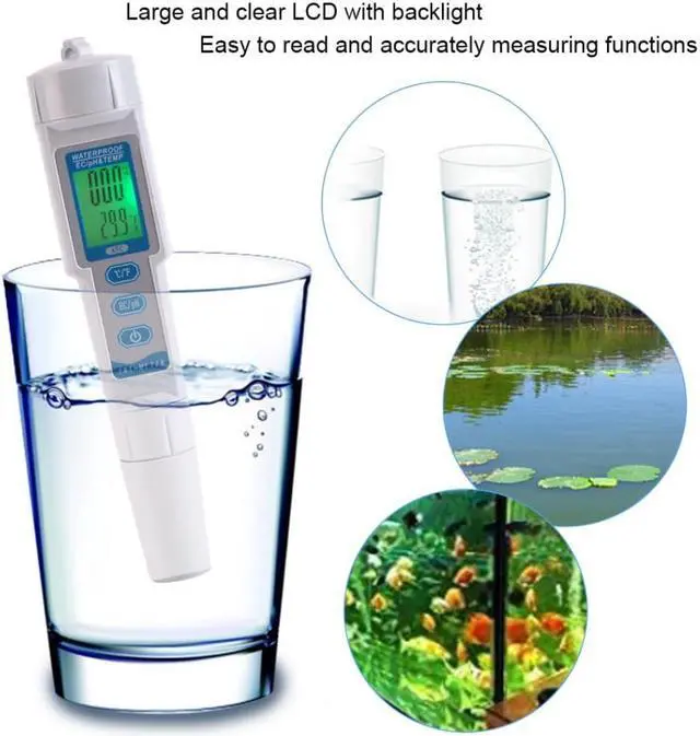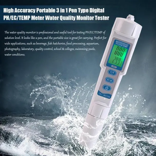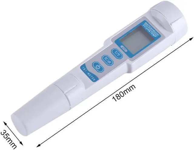 Specification:Material: ABS Color: GreyPower Supply: DC 6V Battery: 4 * 1.5 V AG - 13 battery(not included)Working Temperature: 0~50/32~122Compensation Temperature: 0~50/32~122Accuracy: PH: 0.1pH EC: 2%F.S Temperature: 1 (2)Resolution: PH: 0.01pH EC: 10us/cm Temperature: 0.1(0.2)Measuring Range: PH: 0.00~14.00pH EC: 0.00~19990us/cm Temperature: -50~70/-58~158Product Size: Approx. 18 * 35mm / 7.1 * 1.4inchPackage Weight: Approx. 169g Description:The water quality monitor is professional and useful tool for testing PH/EC/TEMP of solution level. It looks like a pen, and the portable size is great for carrying. Perfect for wide applications, such as beverage, fish hatcheries, food processing, aquarium, photography, laboratory, quality control, school & colleges, swimming pools, water conditions. Features: 3-in-1 meter design. It can be used to measure the pH, EC and temperature of the solution. User-friendly design. Automatic temperature compensation, replaceable electrode probe, easy calibration of pH and EC with a mini-screwdriver. Temperature measuring range between -50~70, able to withstand harsh conditions, offering longer durable services. Large and clear LCD with backlight, easy to read and accurately measuring functions. Apply in water sources, aquarium, hydroponics, laboratory and scientific testing, spas, swimming pools and other water systems. Pocket-sized design with hanging hole, easy to carry, simple to operate and convenient for storage.