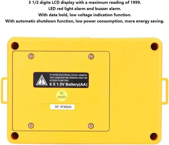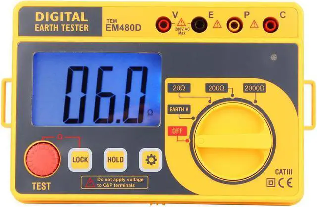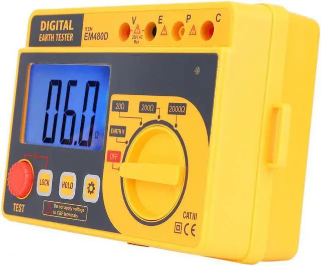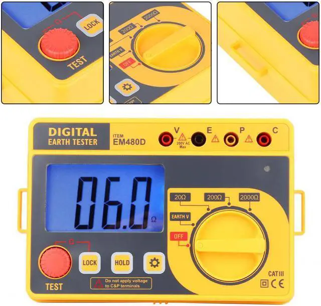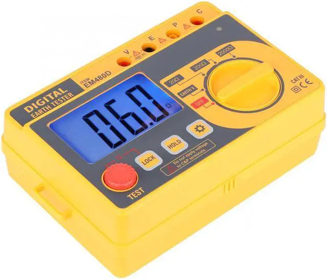 Model: EM480D Measuring range: 20 ~ 200 ~ 2000 (M) Test voltage: 200 (V) Calibration cycle: 1 year Safety level: CAT III200V Maximum voltage: 200V Maximum resistance 2000 Tap resistance button: Yes Data hold: Yes Low voltage indication: Yes Battery powered: Yes Automatic shutdown: Yes Over range display: Yes LCD: Yes Overload : Yes Test button: Yes Backlight display: Yes Grounding Voltage Range Range 200V 0.1V (1.5%+3) Resistance Range Range 20 0.01 0.1 200 0.1 (2%+3) 2000 1 (2%+3) Display 3 1/2 unit symbol display Backlight function Yes Work Environment 5~40, relative humidity 75% Weight approx. 2514g/88.7oz Storage Environment -10~60, relative humidity 85% Power 6* 1.5V AA batteries (NOT included) Over Range Display Only figure "1" on the display Maximum reading 1999 readings Low Power Indication Yes Accuracy 3 1/2 Size 168*110*62mm / 6.6*4.3*2.4in Sampling rate 2.5 times/second Technical Indicators Within one year after the calibration accuracy, temperature of 23 5 , relative humidity: less than 75% 3 1/2 digits LCD display with a maximum reading of 1999. With line warning signs and buzzer alarm, automatic discharge safety without worry. LED gives red light and the buzzer sounds. It indicates that the resistance between "C" terminal and "E" terminal is out of the permitted range. With data hold function, low voltage indication and automatic shutdown function, low power consumption, more energy saving. Suitable for power system, electrical equipment equipment, outdoor testing, etc.