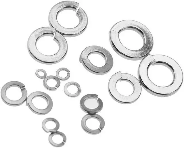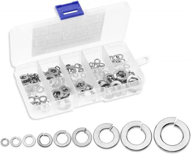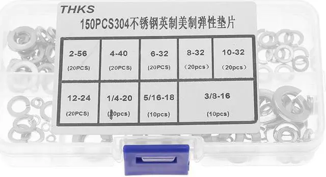 Specification:Material: Stainless steel 304Type: Spring washerQuantity * Size:20pcs * 2-5620pcs * 4-4020pcs * 6-3220pcs * 8-3220pcs * 10-3220pcs * 12-2410pcs * 1/4-2010pcs * 5/16-1810pcs * 3/8-16Weight: Approx. 112g/4oz Features: Made of high quality 304 stainless steel material, these washers are sturdy and has long service. They can be used as a spacer, wear pad, pre-load indicating device, locking device, and to reduce vibration. There are many different sizes in this set, ranging from 2-56 to 3/8-16. All washers are well packed in a plastic box for convenient storage. Each set includes many washers that can be used for a long time, so you don't have to run to hardware store looking for washers for quite a while.