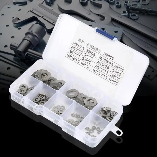 Specification:Material: Stainless SteelQuantity: 170pcsColor: SilverPackage Weight: Approx. 97g/3.4ozPackage list:30 x M2*5*0.330 x M2.5*6*0.530 x M3*7*0.530 x M4*9*0.820 x M5*10*120 x M6*12*1.510 x M8*16*1.510 x M10*20*1.51 x Storage Case Features:1. Made of high quality stainless steel, it is of high hardness and good durability.2. No deformation under great pressure.3. Wear resistant and anti-corrosion, long service life.4. Provides 8 sizes of flat washer for you to meet different requirements.5. All washers is sorted and packed in a plastic case, convenient to carry and use.