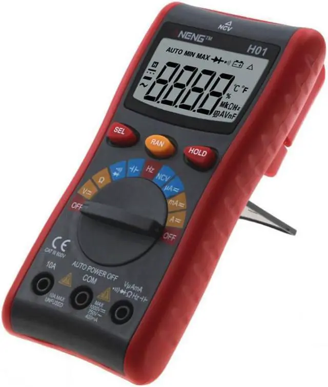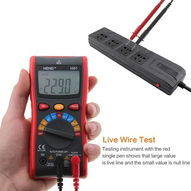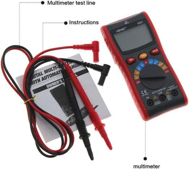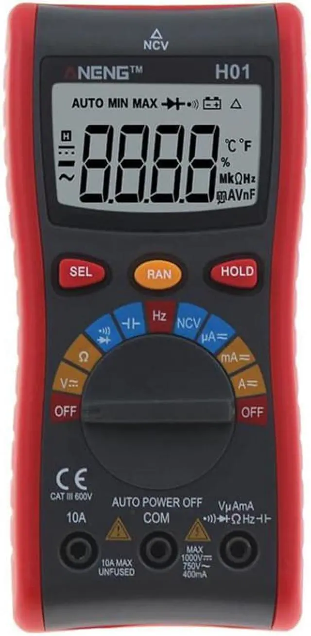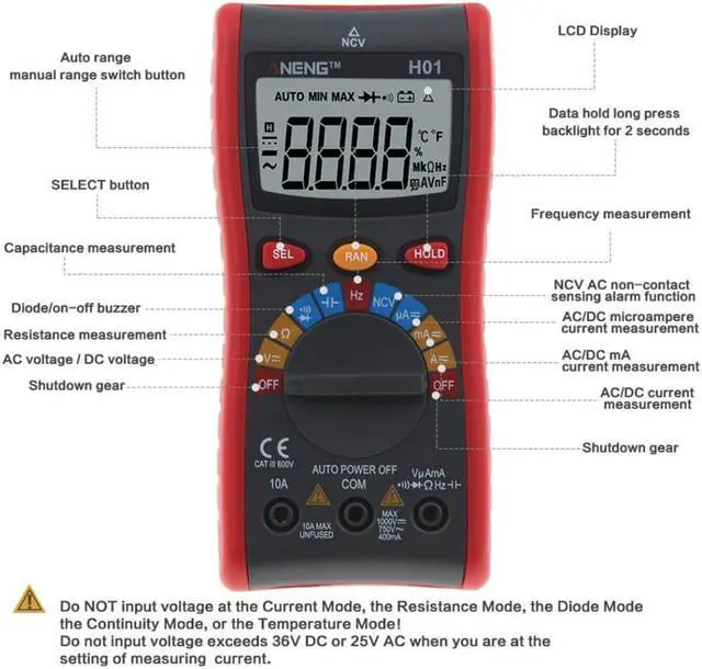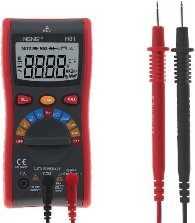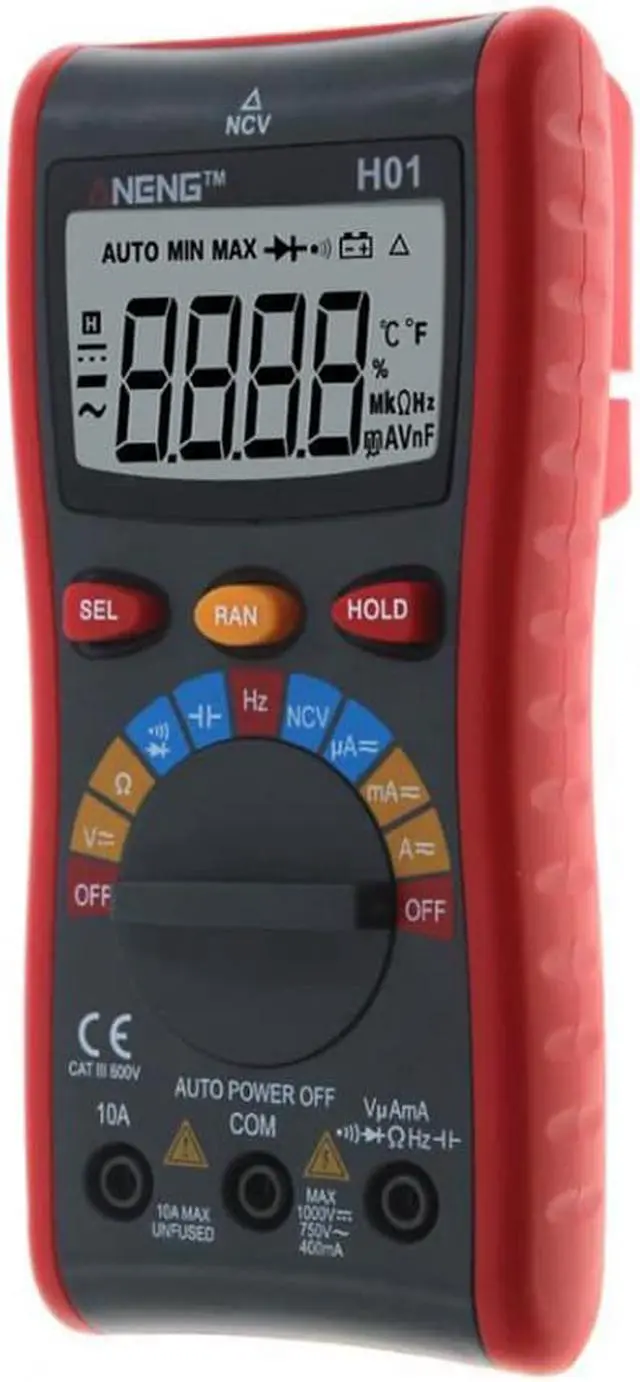Specification:Brand: ANENGModel: H01Material: ABSMeasuring Inductance Range: NOAC Voltage: 400.0mV - 4.000V- 40.00V- 400.0V- 750VDC Voltage: 400.0mV- 4.000V- 40.00V- 400.0V- 1000VMeasuring Resistance Range: 400.0- 4.000k - 40.00k - 400.0k - 4.000M - 40.00MDIY Supplies: The electricianOperating Mode: Automatic range/manual rangeOperating Temperature: 0 - 40 Measuring Capacitance Range: 4.000nF- 40.00nF- 400.0nF- 4.000uF- 40.00uF - 200.0uF- 400.0uFDisplay Type: 4000 CountsDC Current: 4.000A- 10.00ADC Current: 40.00mA- 400.0mADC Current: 40.00uA- 400.0uAAC Current: 4.000A- 10.00AAC Current: 40.00mA- 400.0mAAC Current: 40.00uA- 400.0uAFrequency Range: 99.99Hz-999.9Hz -9.999kHz -99.99kHz-999.9kHz-9.999MHzNCV: Yes (AC 12V-1000V)Diode Test: YesContinuity: YesData Hold: YesBacklight: YesLow Battery Alert: YesAuto Power Off: YesColor: RedBattery: 2pcs x 1.5V AAA Battery (NOT included)Test Lead Length: Approx. 100cm/39.4inchSize: Approx. 150*72*33mm/5.9*2.8*1.3inchWeight: Approx. 268g / 9.5oz Features: LCD screen with backlight, convenient to read in a dim environment. Use NCV function to detecting the AC voltage in a Non-Contact way which avoids being any possible electric shock. Temperature measurement allow you to know the temperature of the objects without directly hand touching. Auto ranging helps correct error to ensures the validity of data. It can be used to measure AC/DC voltage, AC/DC current, resistance, capacitance, frequency, duty cycle, diode, and continuity.