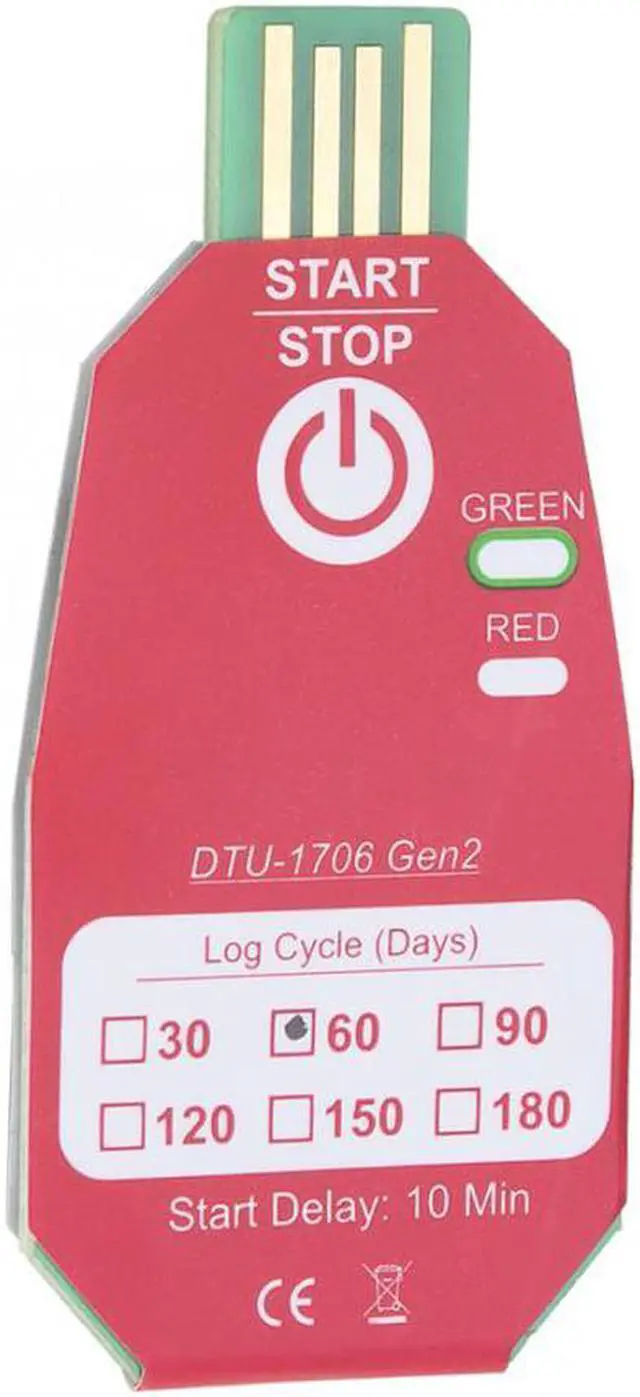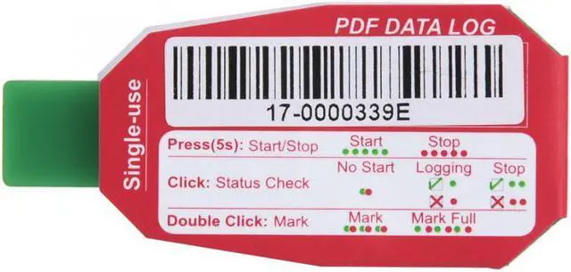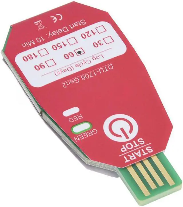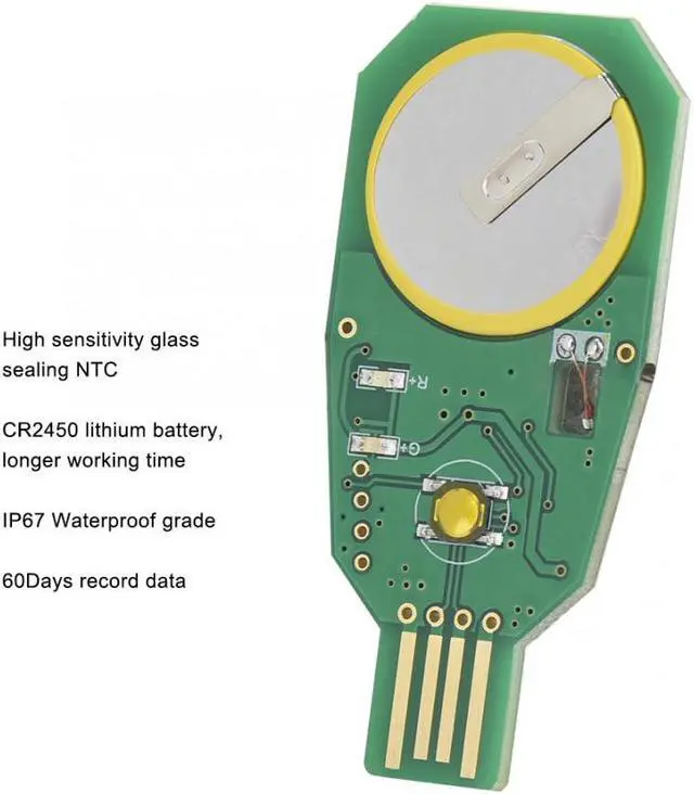 Specification:Model: DTU-1706Measuring temperature: -30 C ~ 70 C (resolution 0.1 C)Measurement accuracy: 0.5 C / 0.9 FRecording capacity: 16000 groupsEndurance energy: 365 days at normal temperature (1 year)Sensor: Built-in high sensitivity glass sealing NTCBoot mode: factory preset timed boot, manual boot, delayed bootManual marking: manual operation of 10 sets of temperature parametersRecording days: 60dysSampling interval: 5M30SStatistics: highest temperature, lowest temperature, average temperature, average temperature MKTParameter category: temperature curve graph table, temperature time history tableParameter information: time zone, start time, deadline, accumulated time, total number of parametersFile System: FAT USB2.0File format: PDF-AWaterproof rating: IP67Storage temperature: -30 C ~ 70 CBattery specifications: 1 * CR2450 lithium batteryMachine weight: about 13g Feature: Temperature sensor has high sensitivity glass sealing NTC, which makes data acquisition more accurate. The battery is powered by CR2450 lithium battery with longer endurance. Food-grade plastic seal is used for the product, and the waterproof grade reaches IP67. Each temperature recorder is equipped with a numerical bar code, which is widely used in the monitoring of transportation temperature in the fields of biomedicine, blood vaccine, food, electronics and chemical industry. Statistical time and temperature changes, temperature high, low, average, average temperature (MKT) value and temperature time, over-temperature cumulative time and other parameters. The product inserts into the computer without installation driver, and automatically generates the temperature report document chart and temperature history information in PDF format, which ensures the reliability and security of the data record.