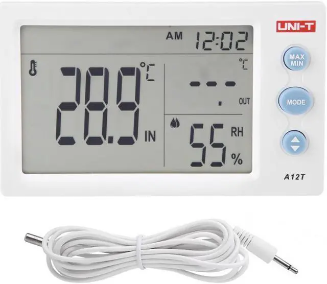 Specification:Model: A12TSampling Time: 10 SecondsClock Function: 12/24 Hour ModeAlarm Function: Ringing Time Up To 60 SecondsTemperature Test Range: -10-50(14-122); Accuracy: 1(1.8)Outdoor Temperature Sensor: -10-50 (14-122); Accuracy: 1(1.8)Humidity Test Range: 10~99% RH; Accuracy: 5%RHWeight: Approx. 148g / 5.2oz Features:1. Large screen displays temperature and humidity in real time with clear readings2. Wall hanging holes and brackets on the back for mounting on the wall or on the table3. Beautiful design and it is convenient to store4. With the highest / lowest temperature memory function, alarm clock function, etc.5. Widely used in laboratories, offices, hotels, schools, factories, conference rooms, etc.