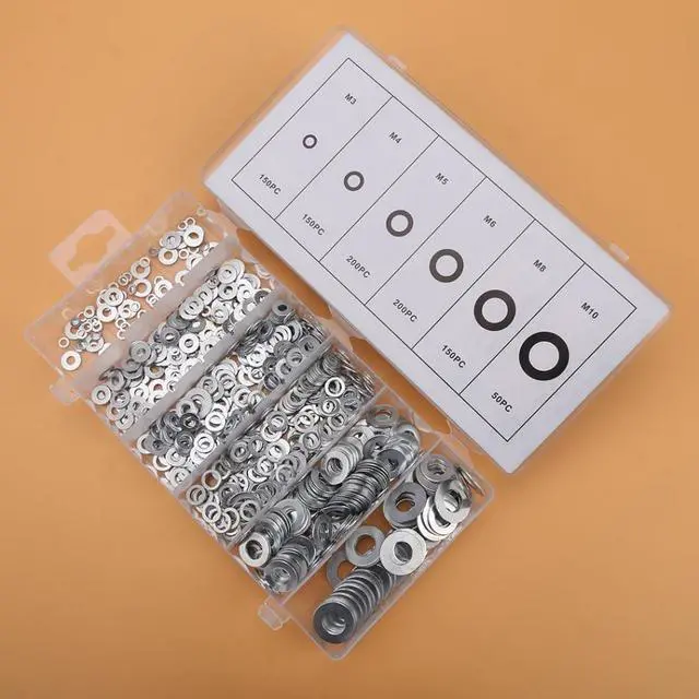 Features: Made of high quality steel material, these flat washers are sturdy and has long service. Flat washers can spread a load, and prevent damage to the surface being fixed, and insulate steel screws from surface. They can be used as a spacer, wear pad, pre-load indicating device, locking device, and to reduce vibration. Flat washer is applied when the hole is a larger diameter than the fixing nut. There are many different sizes in this set. Each set includes many flat washers that can be used for a long time, so you don't have to run to hardware store looking for washers for quite a while.Specifications:Material: A3 steelType: Flat washerColor: SilverSize & Quantity:M3*150pcsM4*150pcsM5*200pcsM6*200pcsM8*150pcsM10*50pcsWeight: 446g(approx.) Description:The washer is a thin disk-shaped plate with a hole in the middle that is normally used to distribute the load of a threaded fastener, such as a screw or nut. Other uses are as a spacer, wear pad, pre-load indicating device, locking device, and to reduce vibration. High-quality bolted joints require hardened steel washers to prevent the loss of pre-load after the torque is applied. Washers are also important for preventing galvanic corrosion, particularly by insulating steel screws from aluminum surfaces.