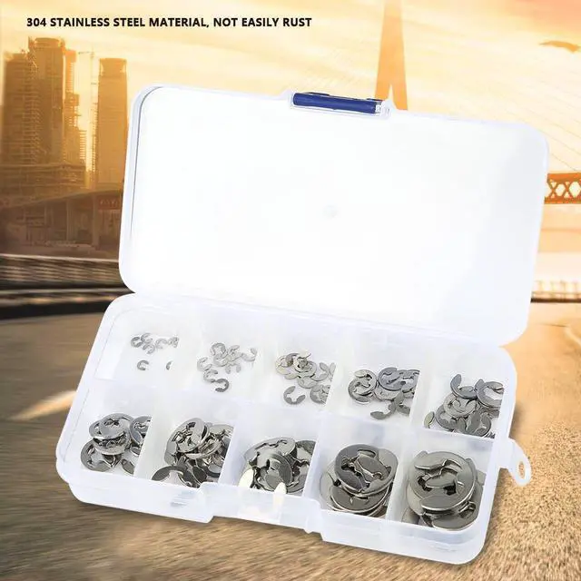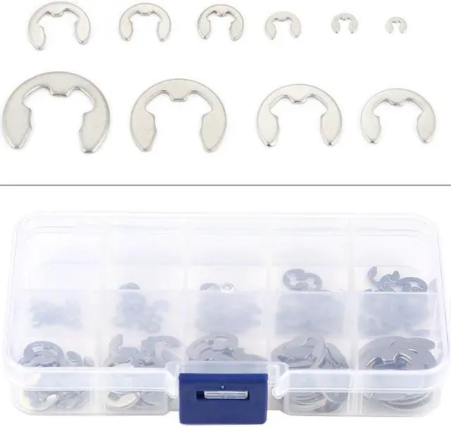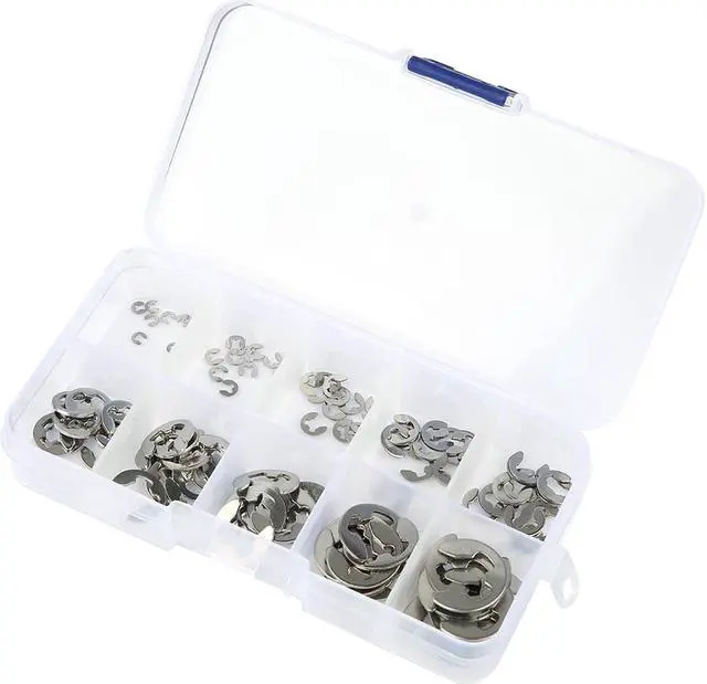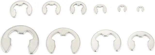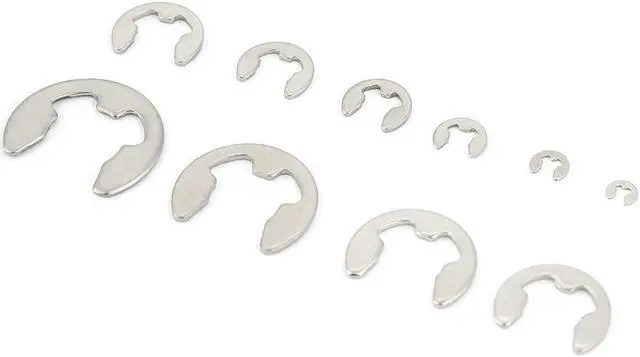 Specification:Type: Retaining RingShape: ESurface Finishing: Nickel platingMaterial: 304 stainless steelApplication: Fasteners for mechanical and industrial useSize & Quantity:1.5mm E-clip (12 pcs),2mm E-clip (12 pcs),3mm E-clip (12 pcs),4mm E-clip (12 pcs),5mm E-clip (12 pcs),6mm E-clip (12 pcs),7mm E-clip (12 pcs),8mm E-clip (12 pcs),9mm E-clip (12 pcs),10mm E-clip (12 pcs)Weight: 80g / 2.8oz (approx.) Features: Made of high quality stainless steel material, these e-clips are sturdy and has long service life. There are many different sizes of e-clips that you can use for different purposes and projects. This set includes 120 pieces e-clips so you do not have to worry about running out of e-clips for quite a while. Usually used on axles, or any rotating shaft in a tube, they slip over the shaft and lock into small slots in the tube. Also used to secure the pin that locks a piston on to the engine rod. These e-clips would be great replacement of broken ones for a wide variety of securing tasks around repair shop or home.