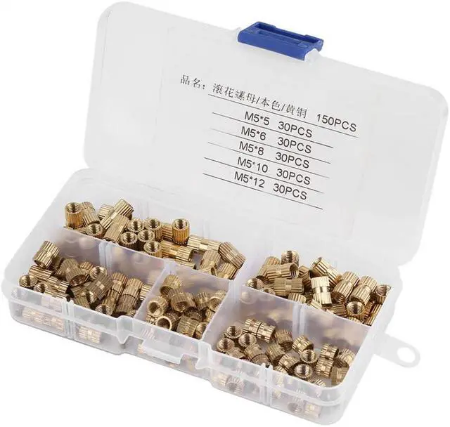 Specification:Material: BrassQuantity: 150pcsColor: YellowPackage Weight: Approx. 146g/5.1ozPackage list:30 x M5*5 30 x M5*630 x M5*830 x M5*1030 x M5*12 Features:1. Made of high quality brass, it is of high hardness and good durability.2. No deformation under great pressure.3. Resistant to wear, oxidation and corrosion, long service life.4. Knurled surface makes nuts embed installed object tightly and stably.5. High precision threads is compatible with corresponding screws.6. All nuts is sorted and packed in a plastic case, convenient to carry and use.