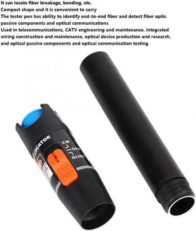 Specification:Model: BWJ650-10 Output optical power: 10MWOutput distance: 10KMOutput wavelength: 65010nmFiber Optic Adapter: Universal ConnectorOperating temperature: 0-60Storage temperature: -20-70Battery type: 2 * AA battery(not included)Mode: Constant Light Type and Pulsed Type Features:2. It can locate fiber breakage, bending, etc.3. Compact shape and it is convenient to carry4. The tester pen has ability to identify end-to-end fiber and detect fiber optic passive components and optical communications5. Used in telecommunications, CATV engineering and maintenance, integrated wiring construction and maintenance, optical device production and research, and optical passive components and optical communication testing